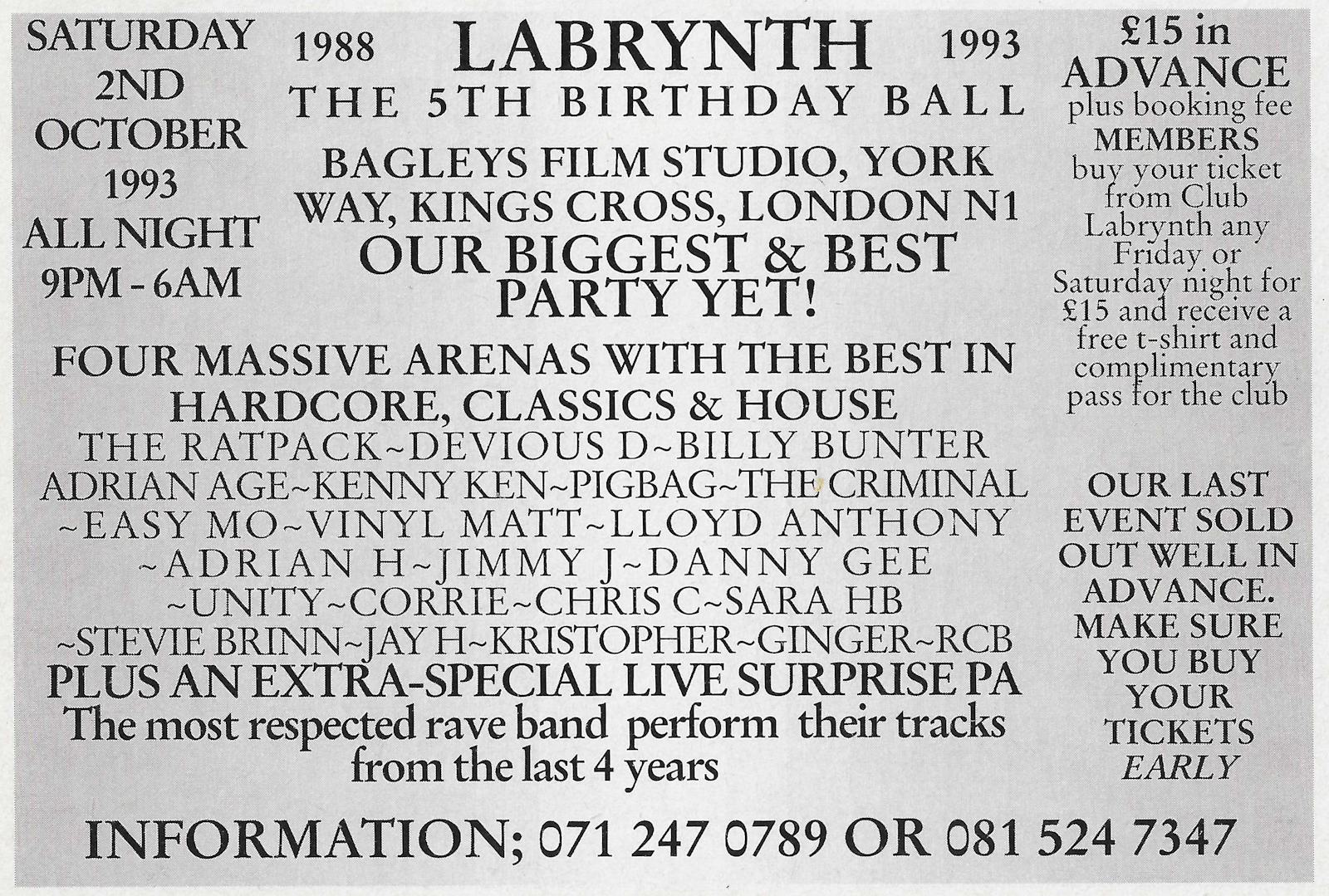 - Labrynth 5th Birthday Party Saturday 2nd October Bagleys Film Studio, York Way, Kings X, London, N1