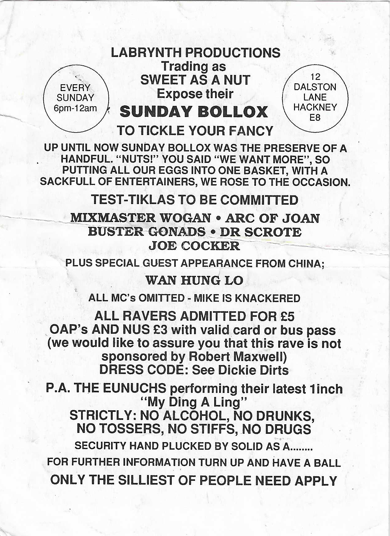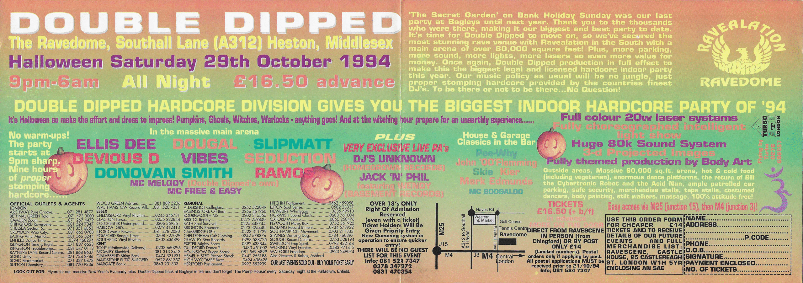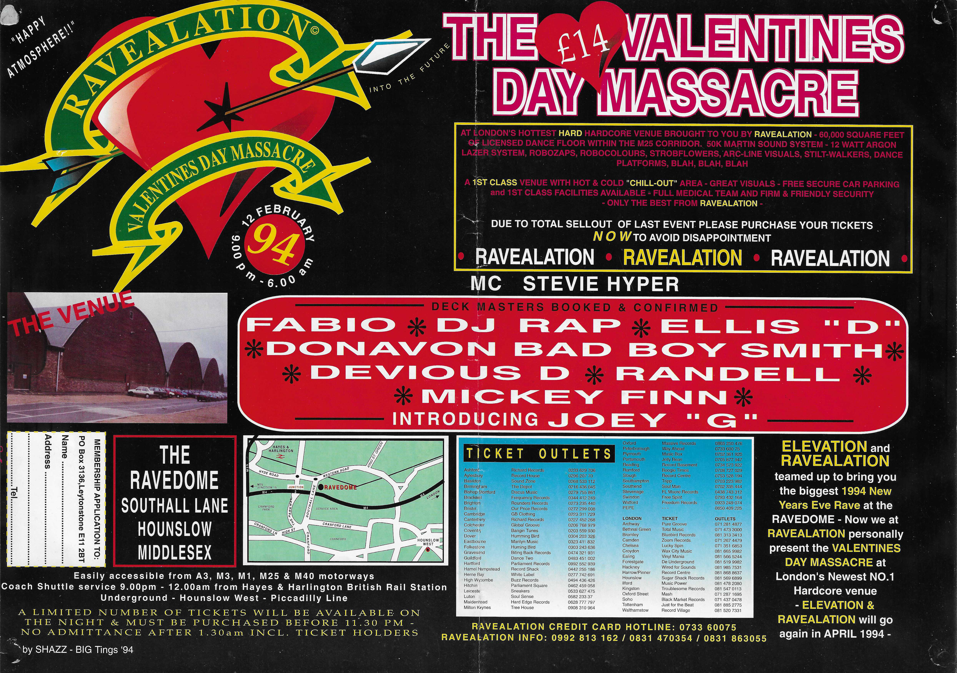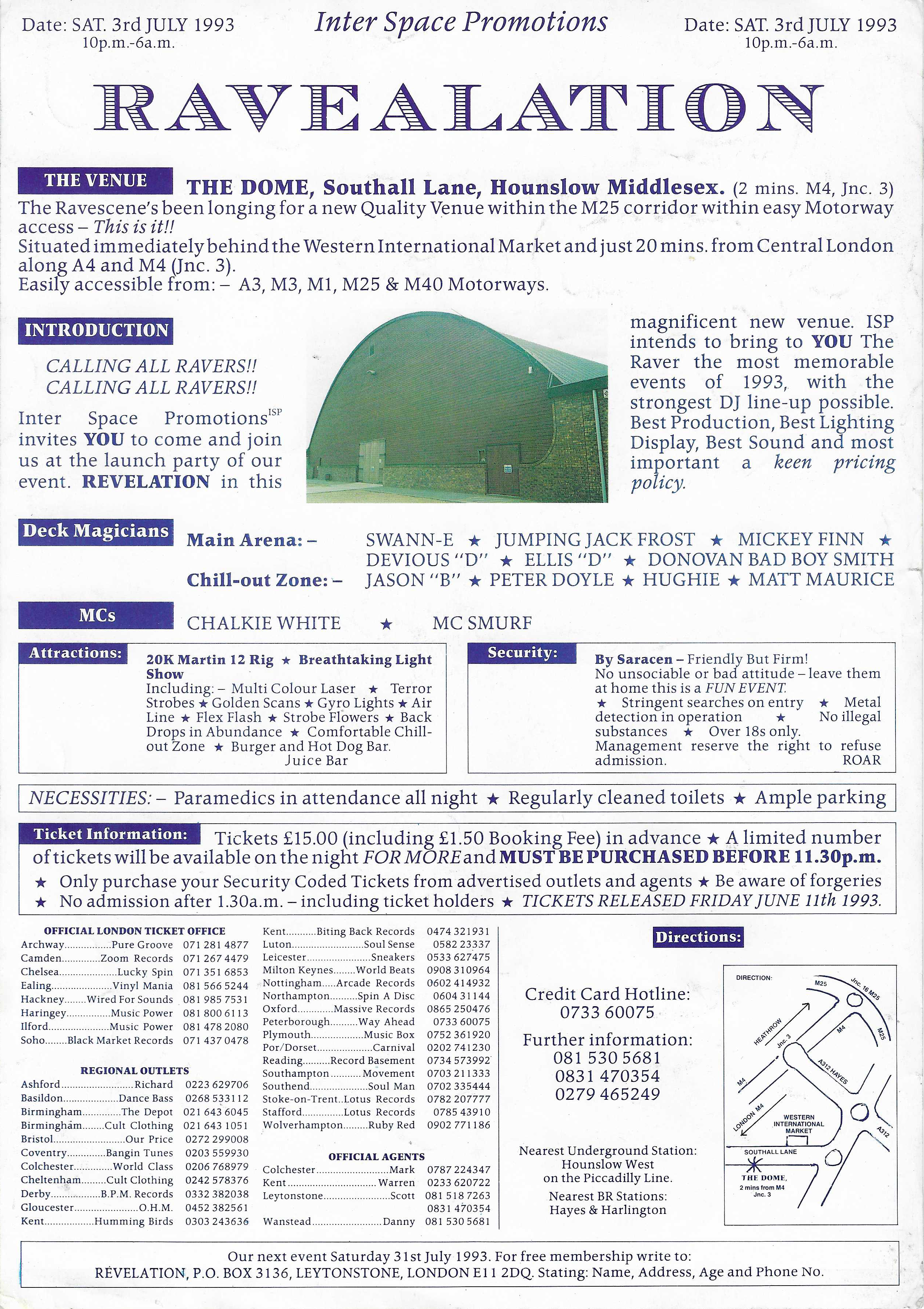 Based on the description indicating it’s a launch party, Ravealation’s first event took place on 3 July 1993, promoted (or at least co-branded) by Inter Space Promotions (ISP). Their early events were all held at The Rave Dome, on Southall Lane, Hounslow, and their official mailing address was P.O. Box 3136, Leytonstone, London (E11 2DQ or occasionally E11 2BT – Danny & Alex). During 1993/4 they aligned themselves with other promoters such as Elevation and Double Dipped.