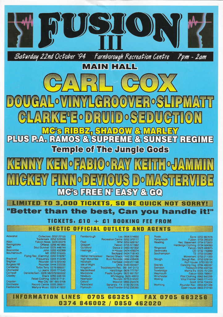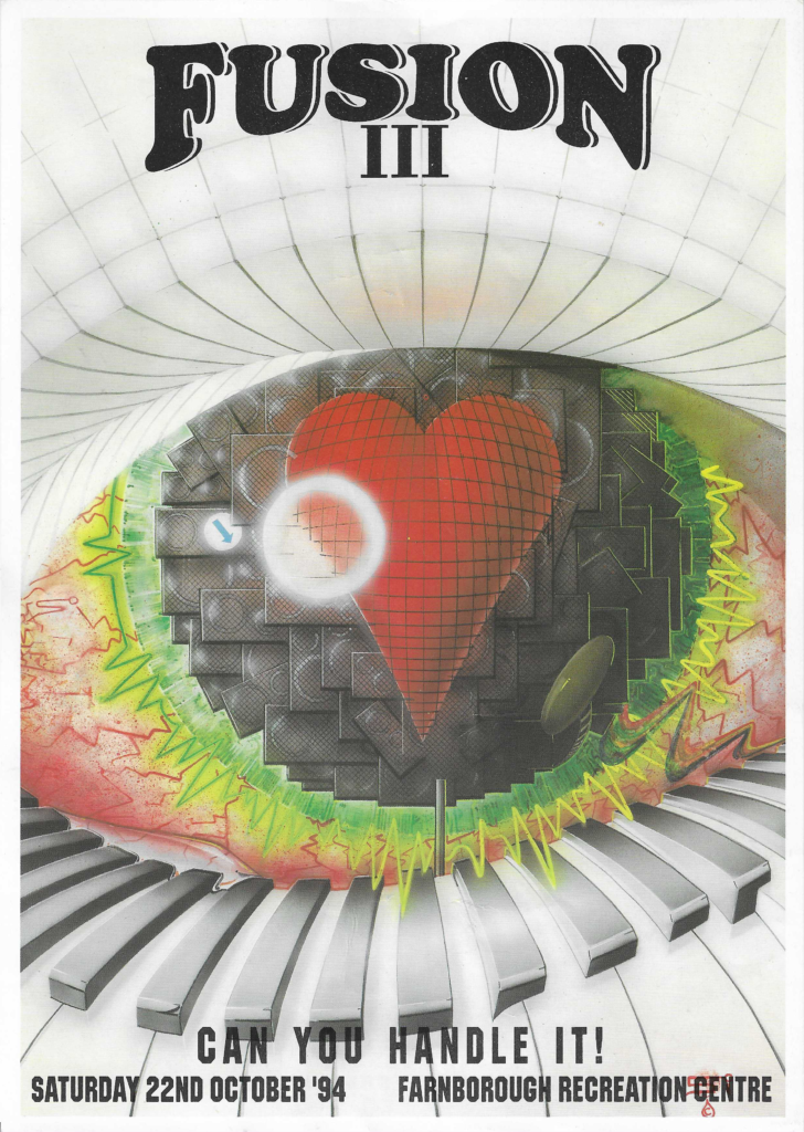 Energy ’92 was co-promoted by Karma Productions and Hectic Productions. It was mentioned in the text on the October 23rd Fusion flyer and the main image of the 2 faces is consistently used on many subsequent Fusion flyers.