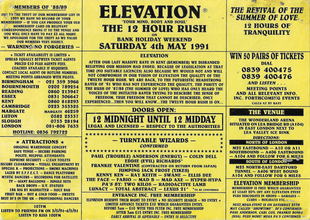 The first Elevation event was at the Wonderland Arena way back in 1991. The the name Elevation came about because it suggests something being uplifting — which is what the raves are, uplifting!