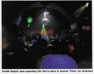 “From the very first issue it was a hit. We printed around 40,000 copies every fortnight and from the beginning we were totally independent. We wrote reviews of clubs and vinyl, and we attracted some really good contributers. Kris the aritist was amazing. He was only 15 when he started drawing for us, and he beats Pez hands down. He designed the double dipped logos – the purple ohm and the techno raver. Claire Henderson wrote the articles on drugs, and they were properly researched and factual. Not made up crap and hearsay. We listed all the forthcoming events and all the gossip from the scene.
