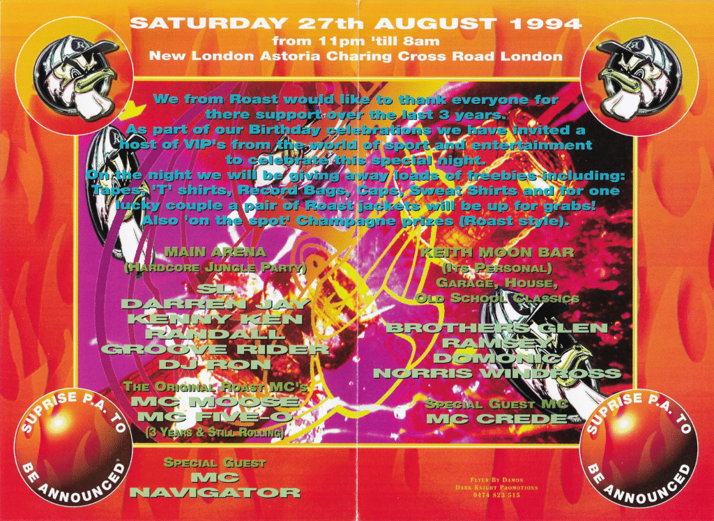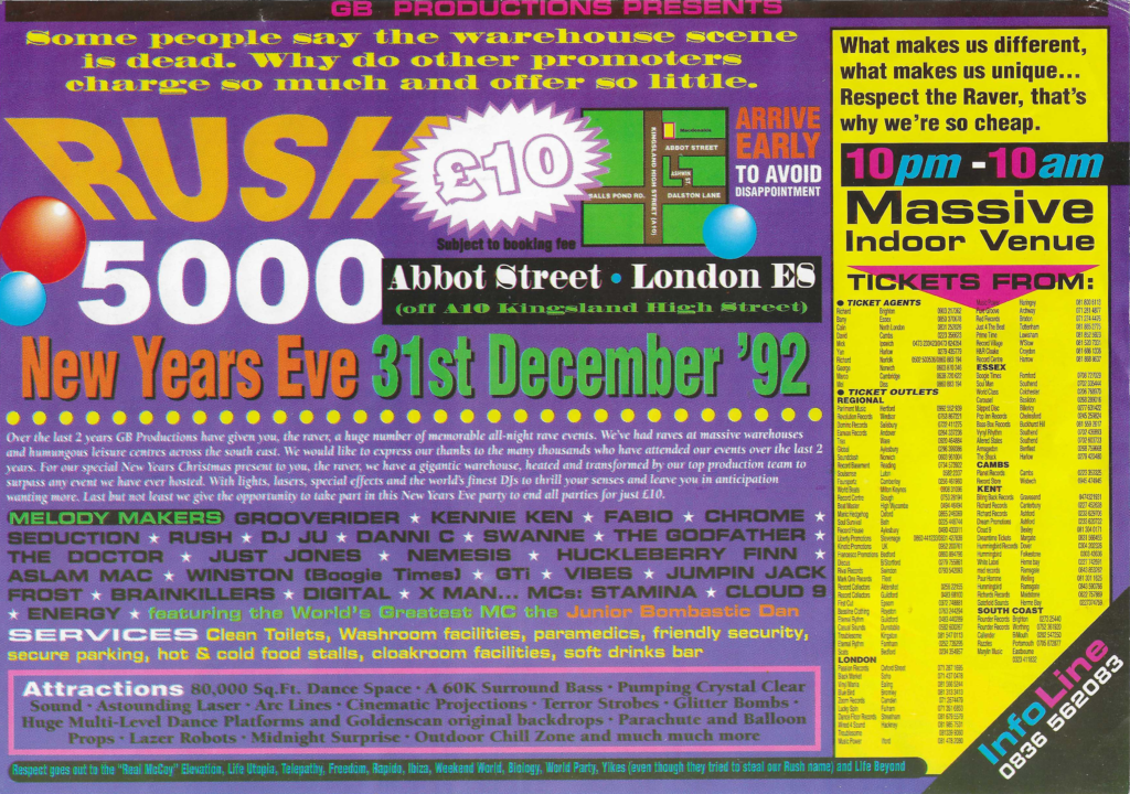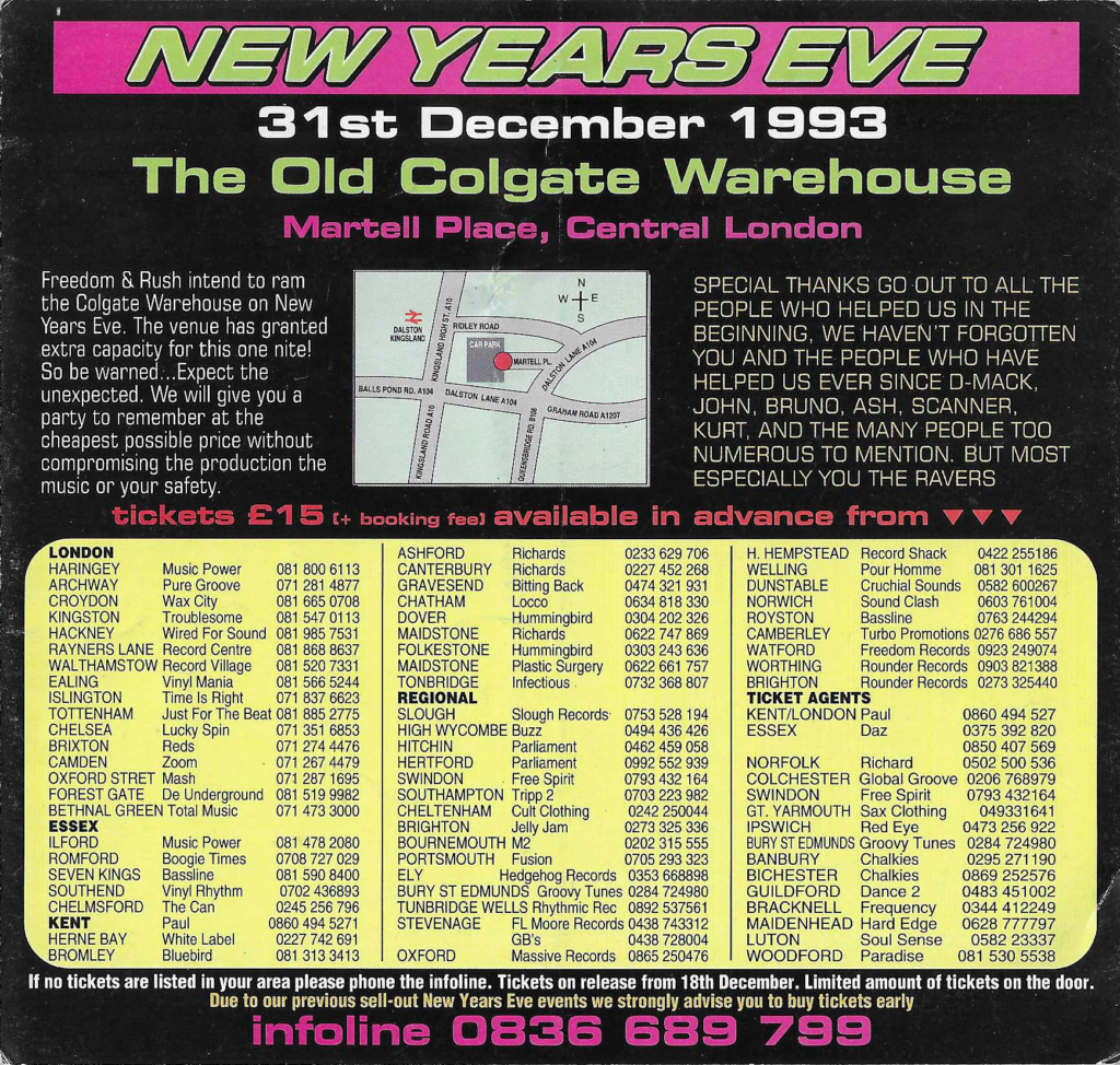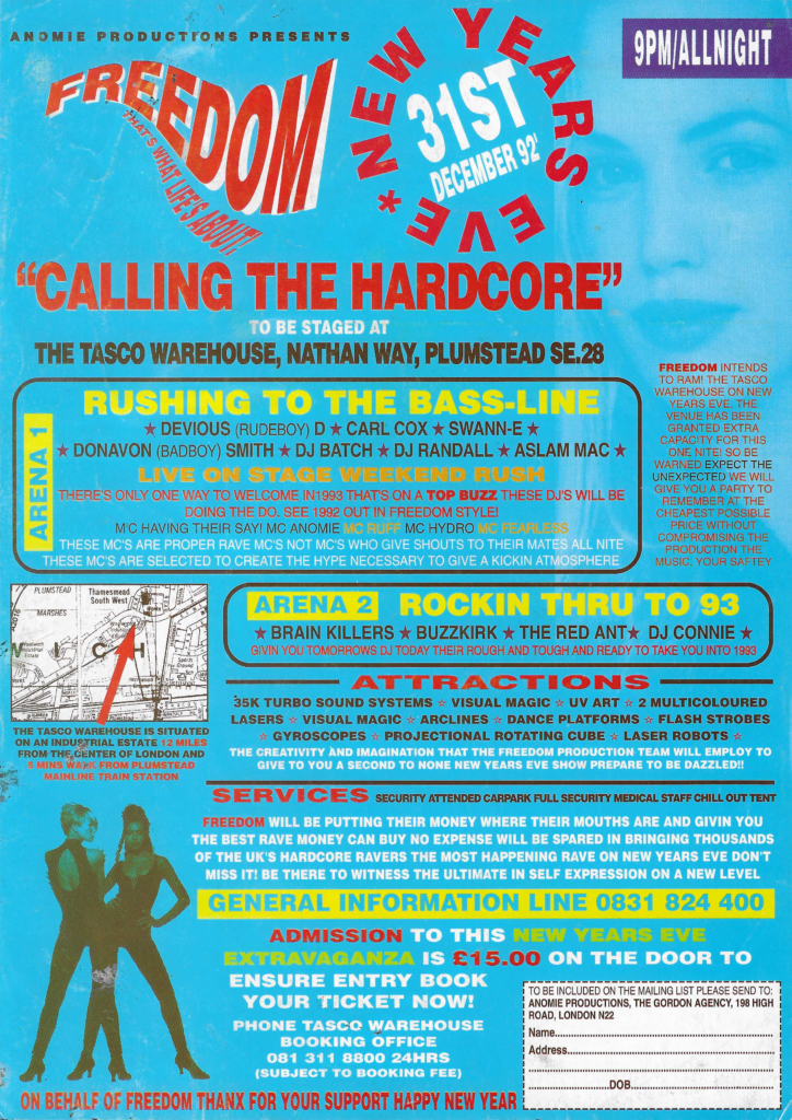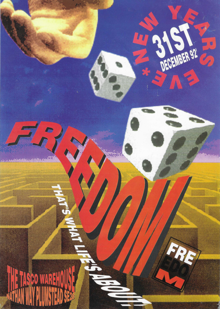 New Years Eve 93 Time to play the ace! Tasco Warehouse Part III – The trilogy. Freedom couldn’t have planned it any better. Tasco Warehouse had now become the best venue in the South East and those who took a chance and went elsewhere regretted it. The flyers were given out… the DJs were booked. The night arrived… the queues were beyond belief. So many expectant ravers Freedom had to open two entrances. The best rave ever hosted at Tasco Warehouse. And there the story ends!