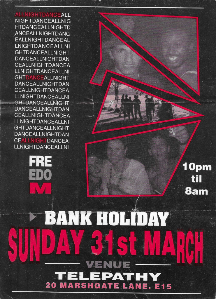 Bank Holiday Easter Sunday – March 91 Many thought Freedom had lost their way, but we came back with an explosion of dance. The 1st ever legal bank holiday Sunday all-nighter. From all over England, thousands came to Marshgate Lane to experience the biggest Bank Holiday Sunday Rave to date. They queued for hours but it was worth every minute’s wait. Everybody who was anybody was there. The creme de la creme of the world’s finest DJs performed to an expectant crowd. A wildly appreciative crowd of over 3000 setting a standard which others have tried to follow.