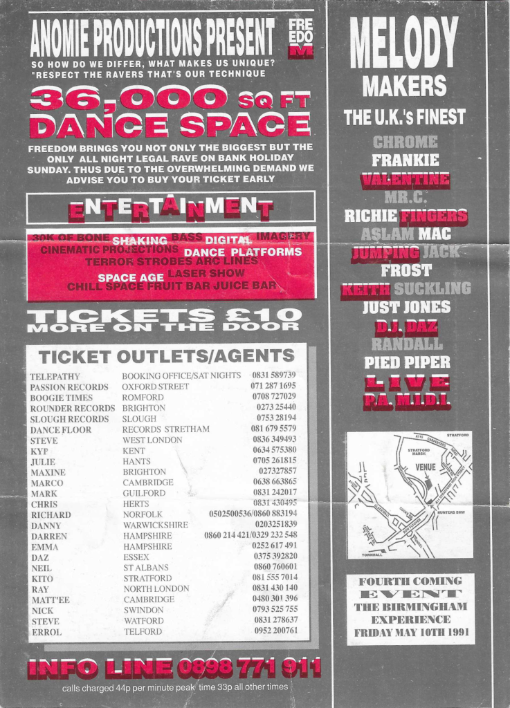 April 10th 91 The Birmingham Experience was a rave too far? Was it the wrong venue? Who can say. Our faithful followers came from miles around but we learned a lesson and from then on stayed firmly in London.