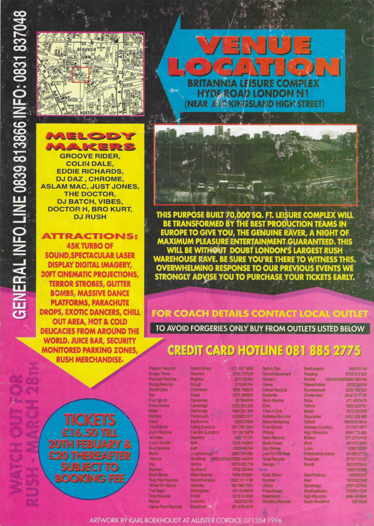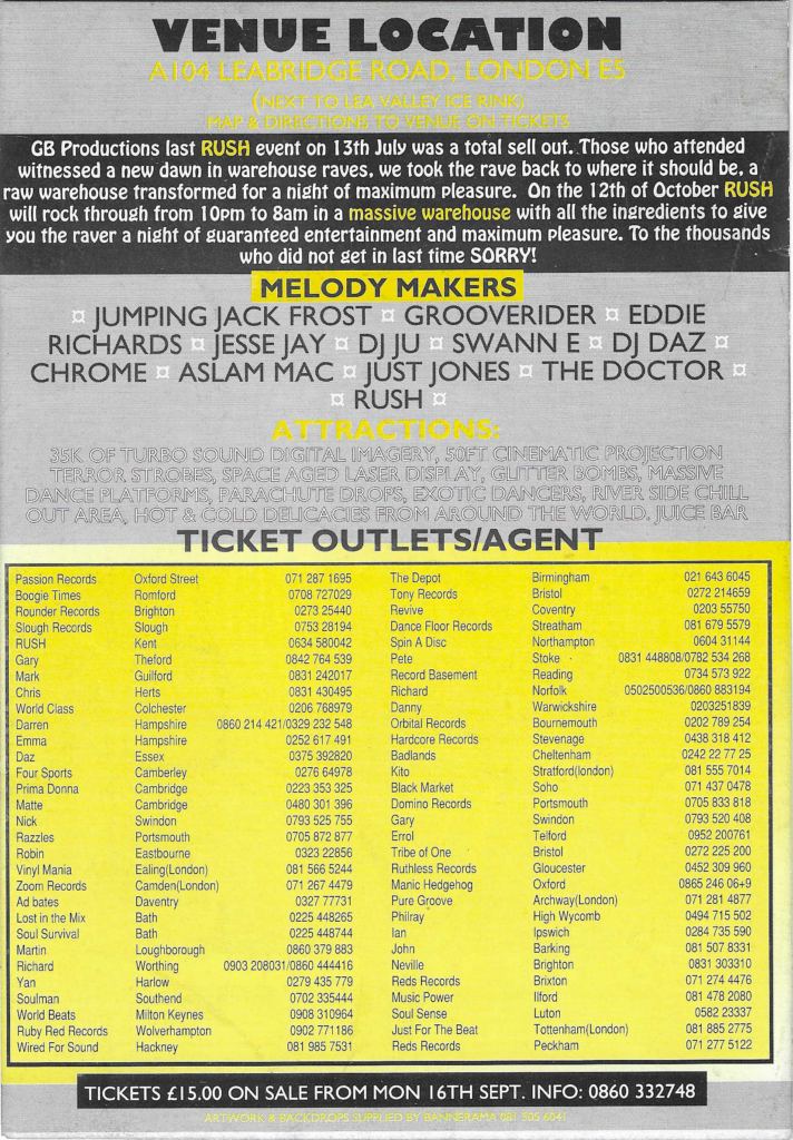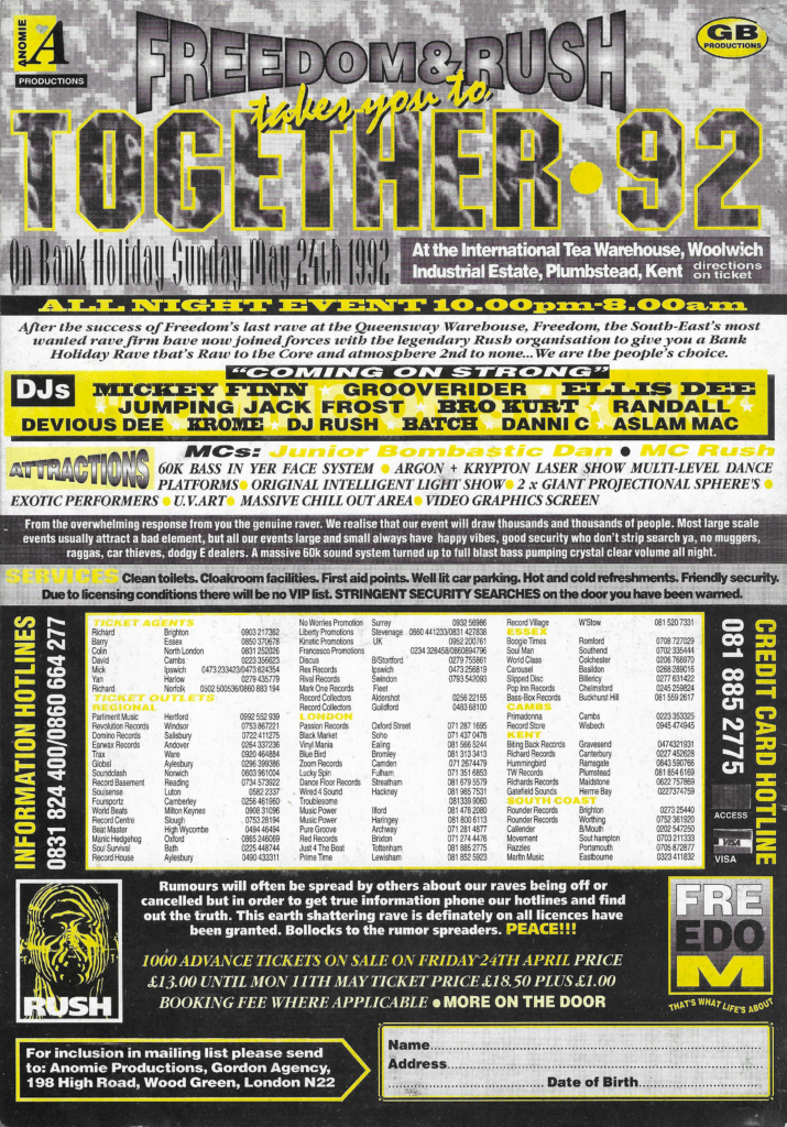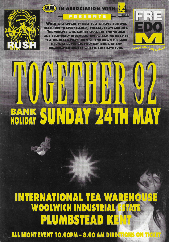 Bank Holiday Sunday, May 24th 92 – Tasco Warehouse Part I Approached by another organisation who knew our pulling power, Freedom decided to join up with Rush to give our public what they wanted… a bank holiday Sunday bash the way it should be done.