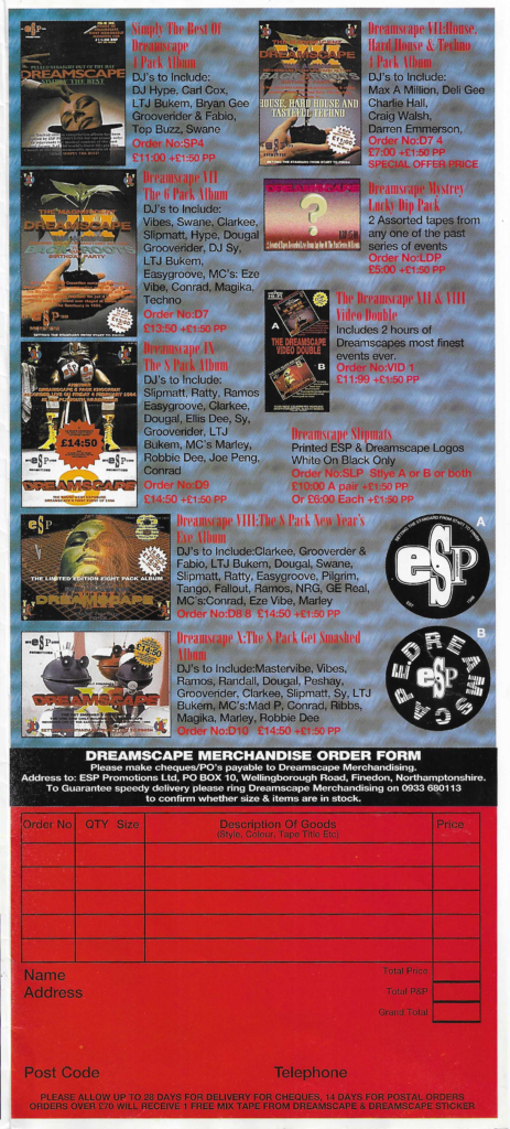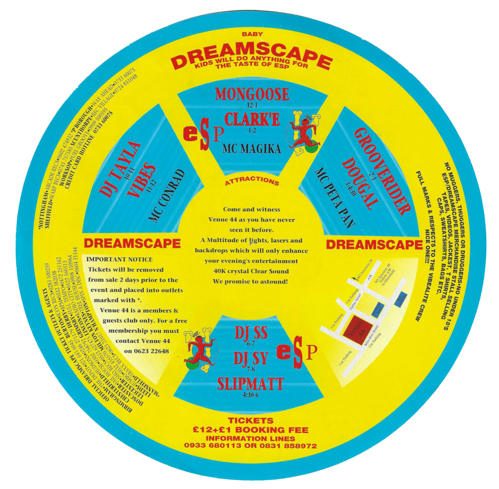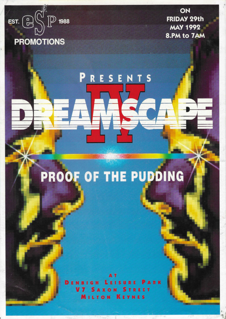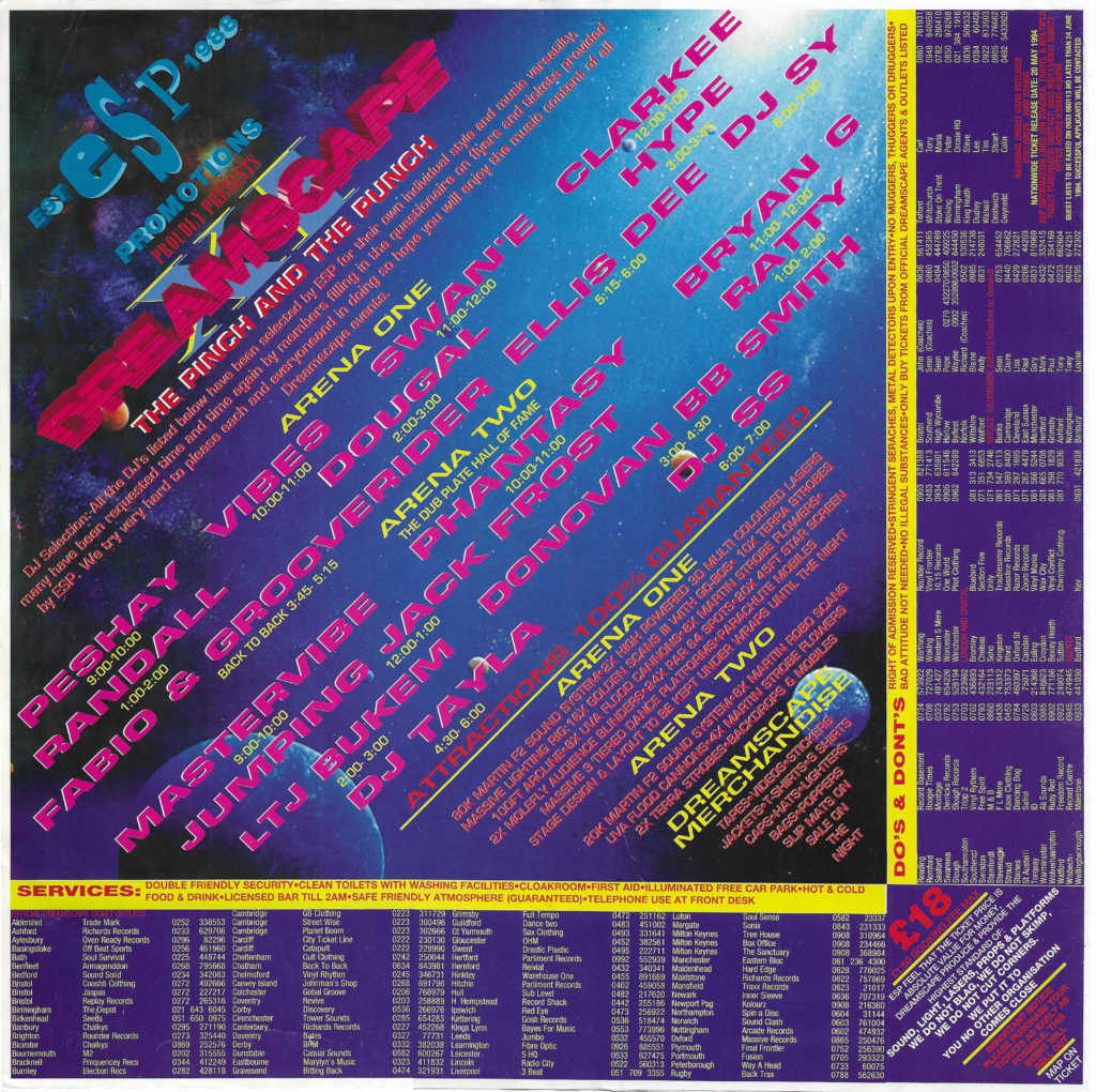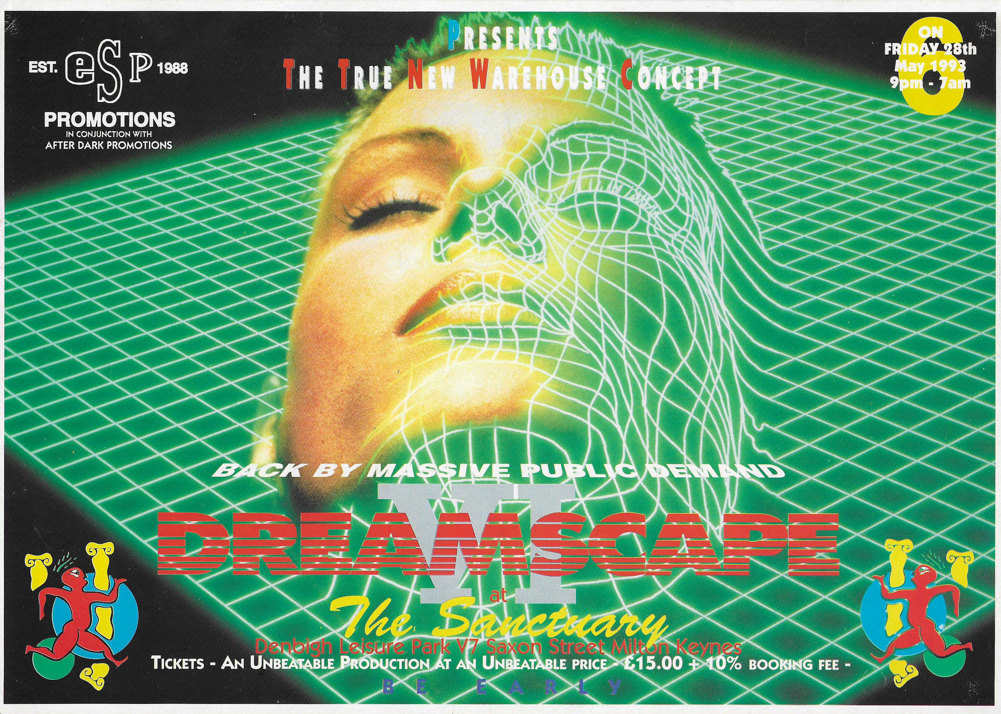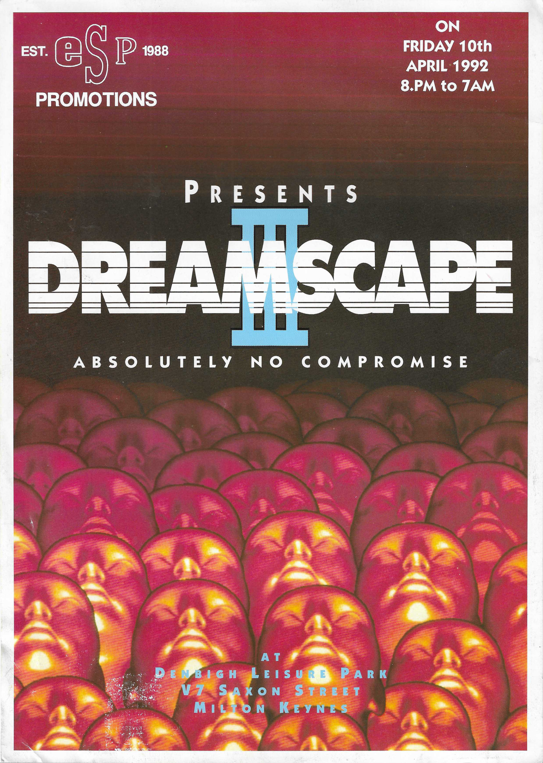 ESP Promotions 24th January 1992 10th April 1992 – Dreamscape III 29th May 1992 – Dreamscape IV 18th December 1992 – Dreamscape V 28th May 1993 – Dreamscape VI 19th June 1993 – The Meeting Of Two Minds 26th November 1993 – Dreamscape VII 31st December 1993 – Dreamscape VIII 8th April 1994 – Dreamscape X 29th April 1994 – Baby Dreamscape 1st July 1994 – Dreamscape XI 26th August 1994 – Dreamscape XII 29th October 1994 – Dreamscape XIV