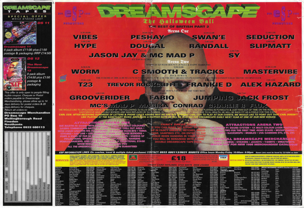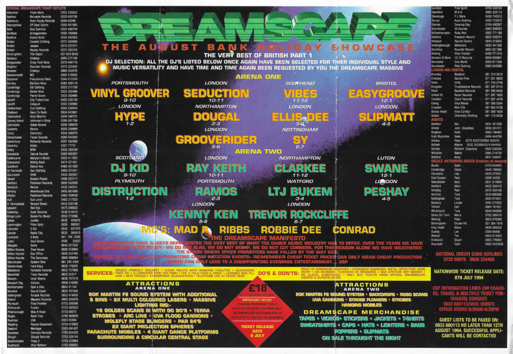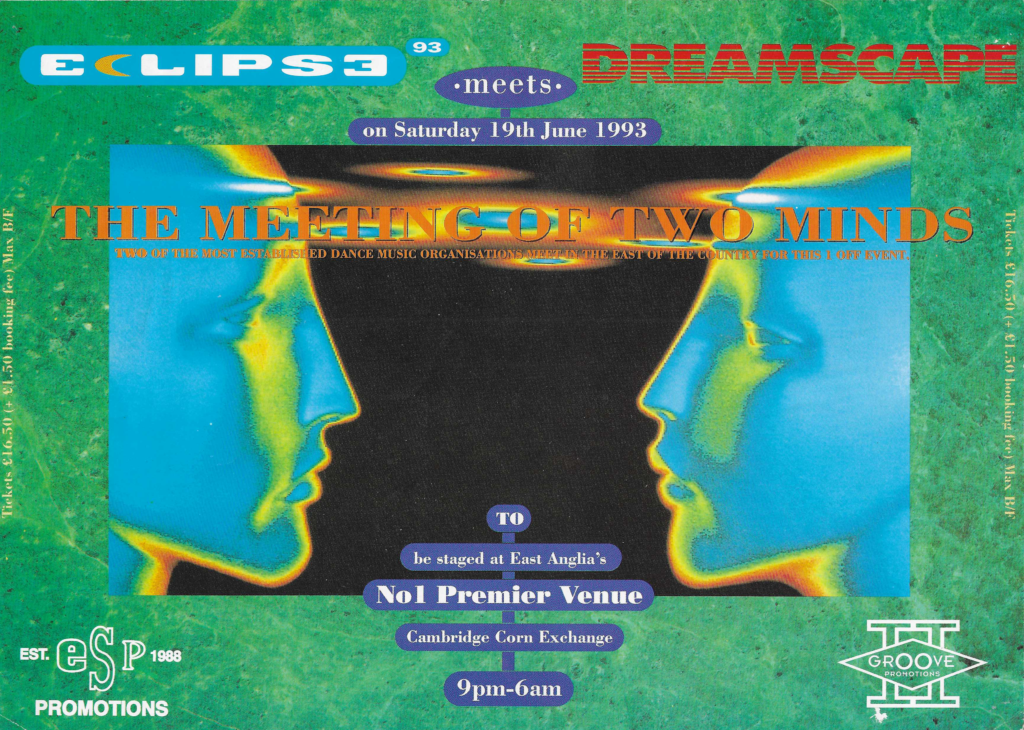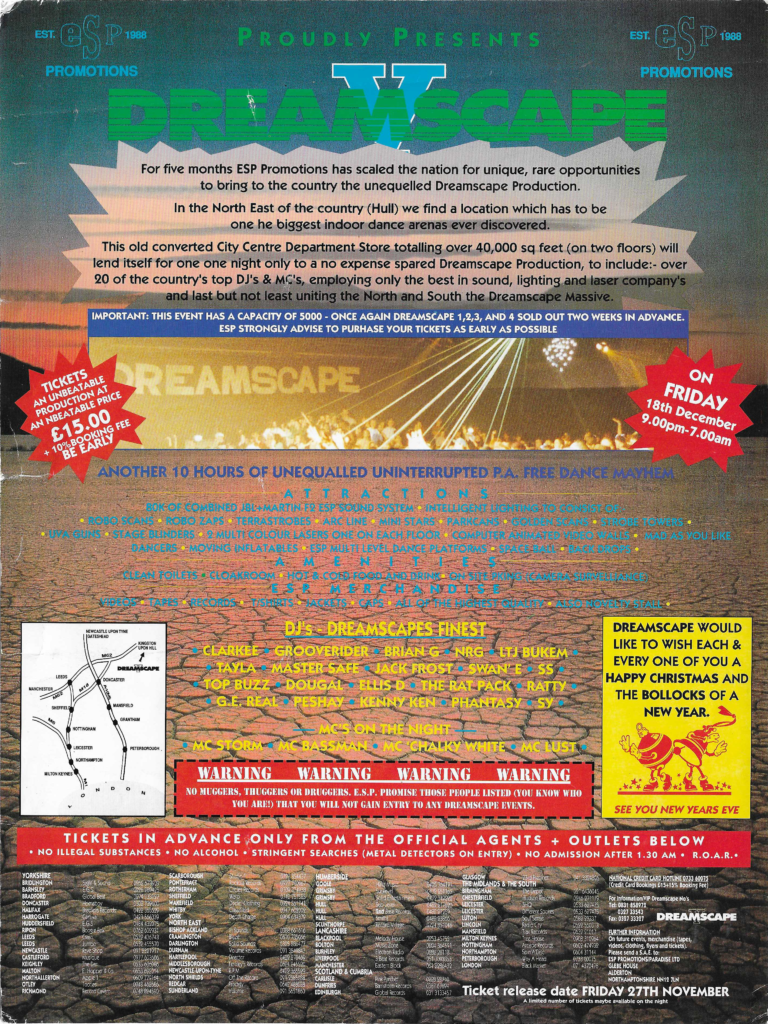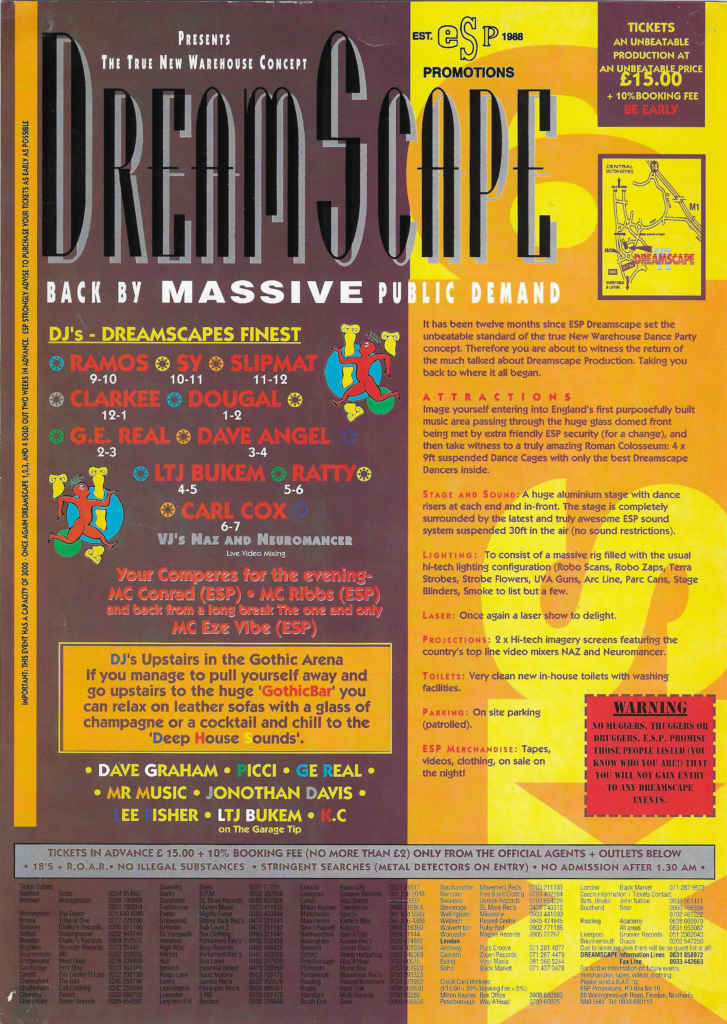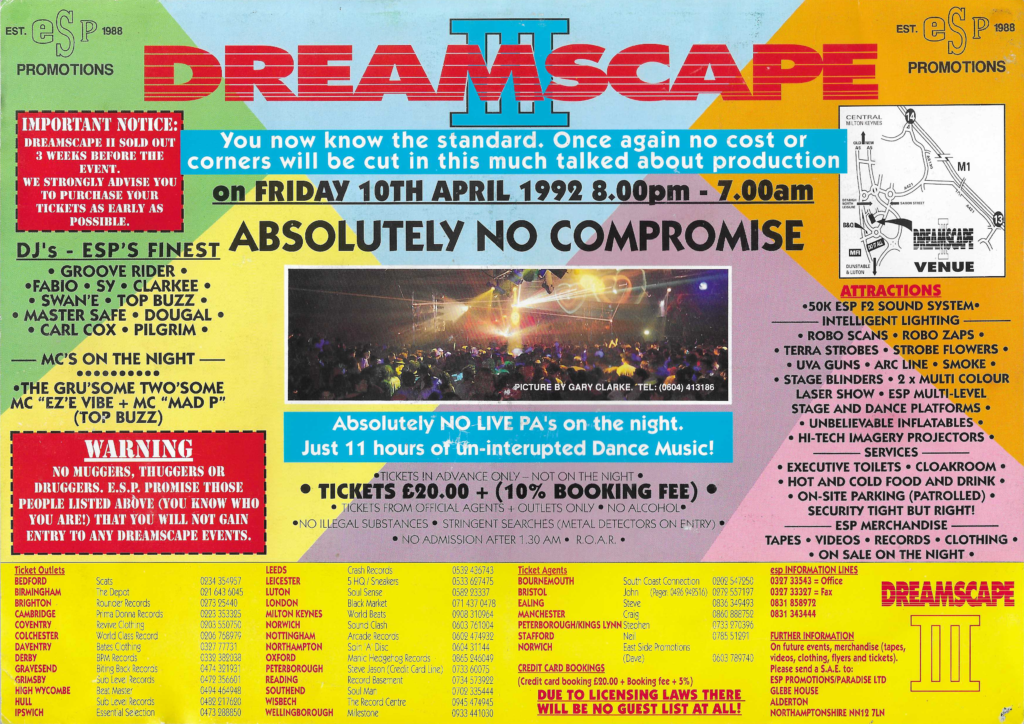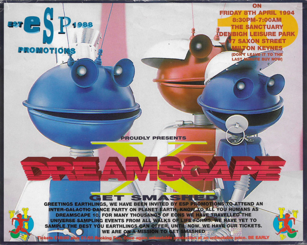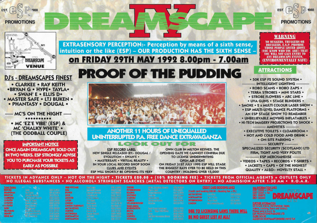 ESP Promotions 24th January 1992 10th April 1992 – Dreamscape III 29th May 1992 – Dreamscape IV 18th December 1992 – Dreamscape V 28th May 1993 – Dreamscape VI 19th June 1993 – The Meeting Of Two Minds 26th November 1993 – Dreamscape VII 31st December 1993 – Dreamscape VIII 8th April 1994 – Dreamscape X 29th April 1994 – Baby Dreamscape 1st July 1994 – Dreamscape XI 26th August 1994 – Dreamscape XII 29th October 1994 – Dreamscape XIV