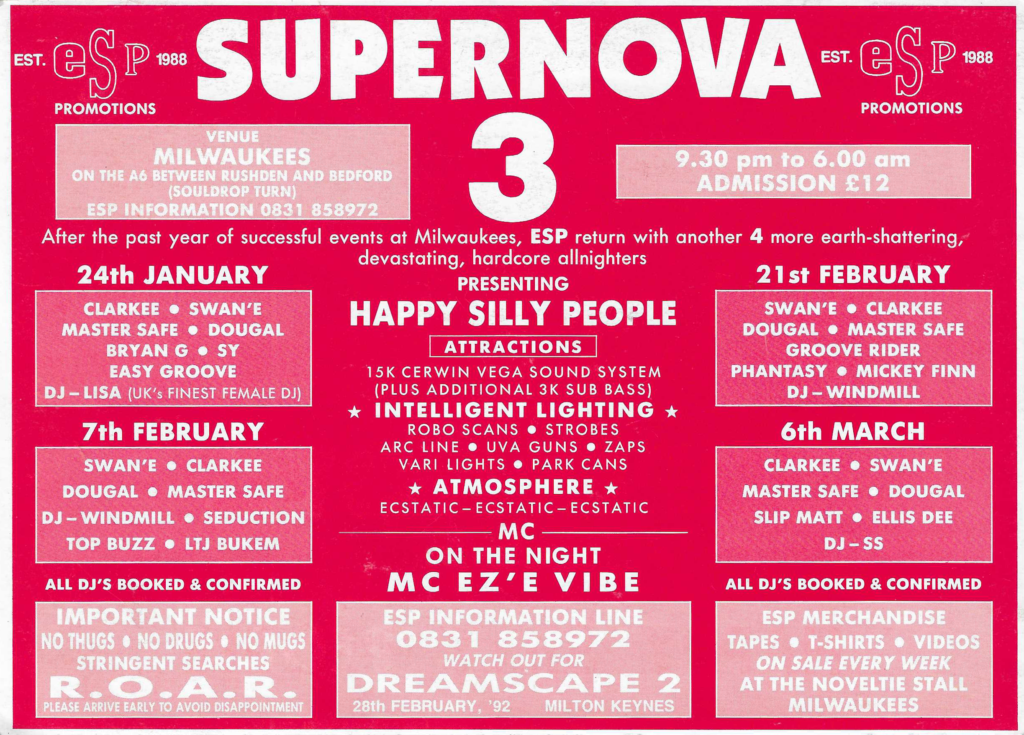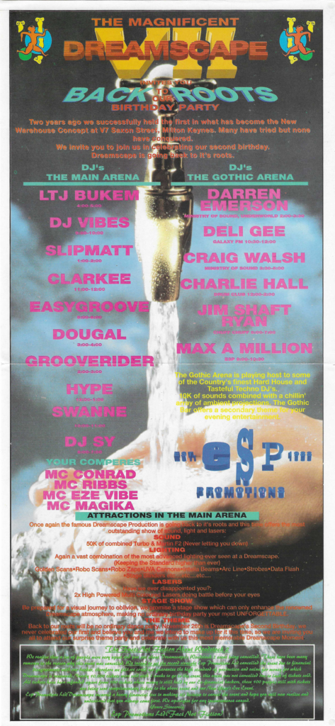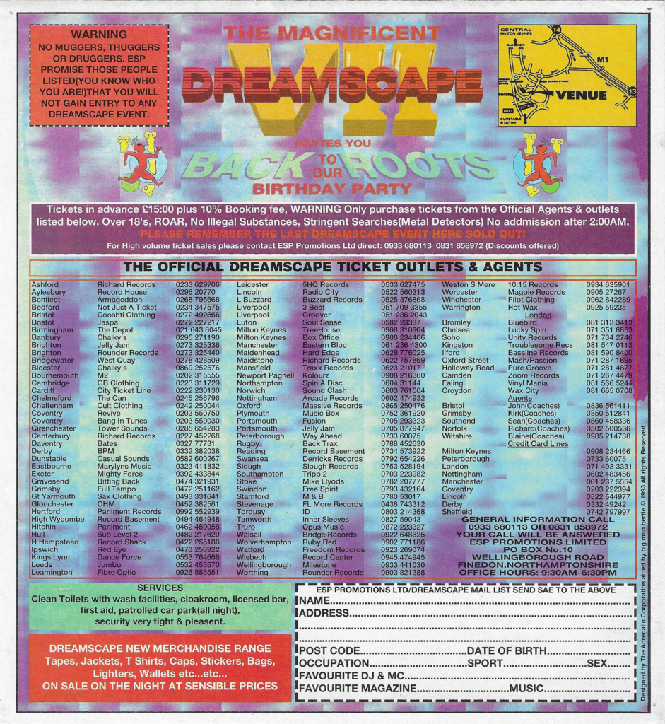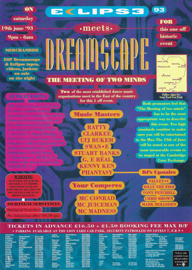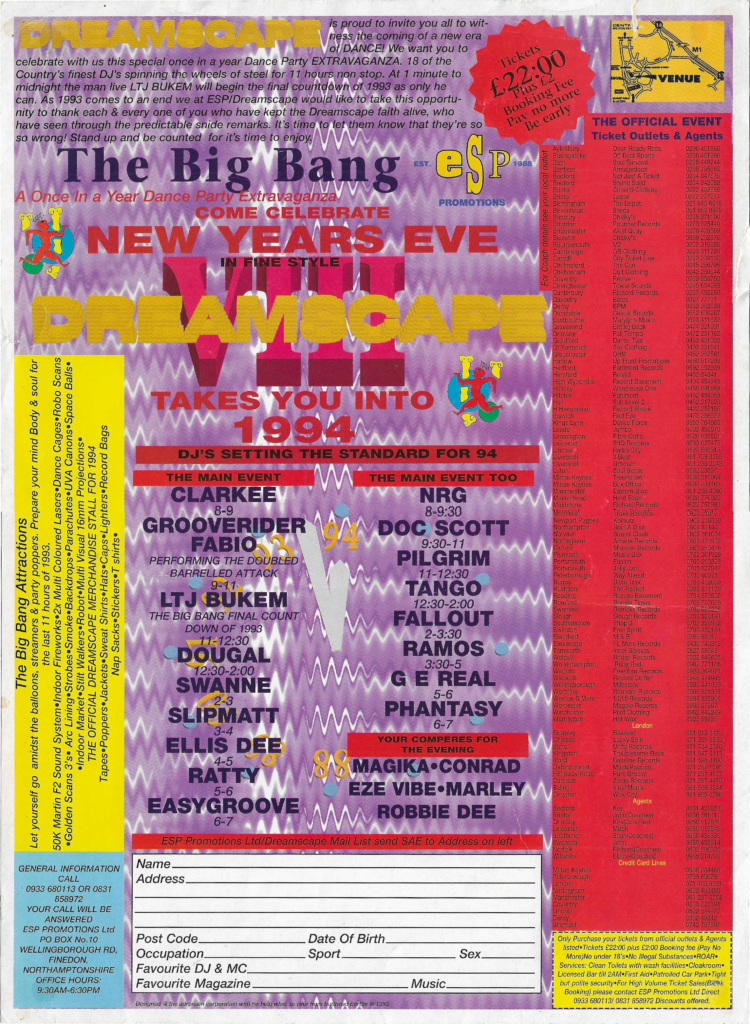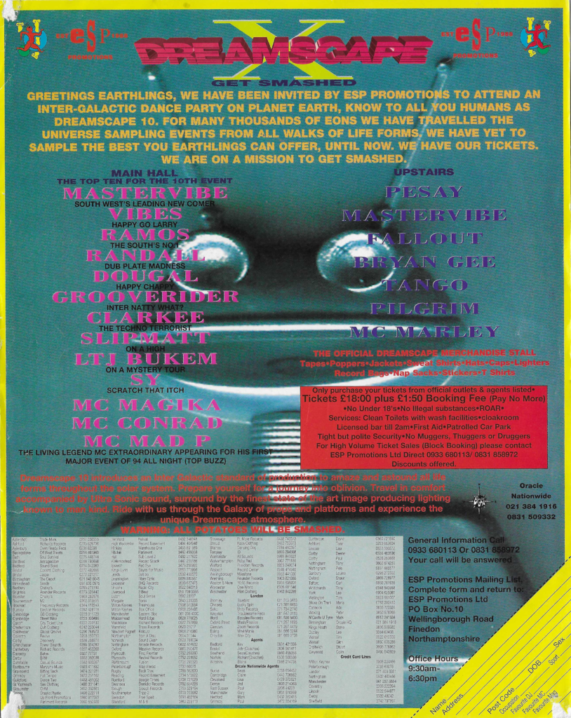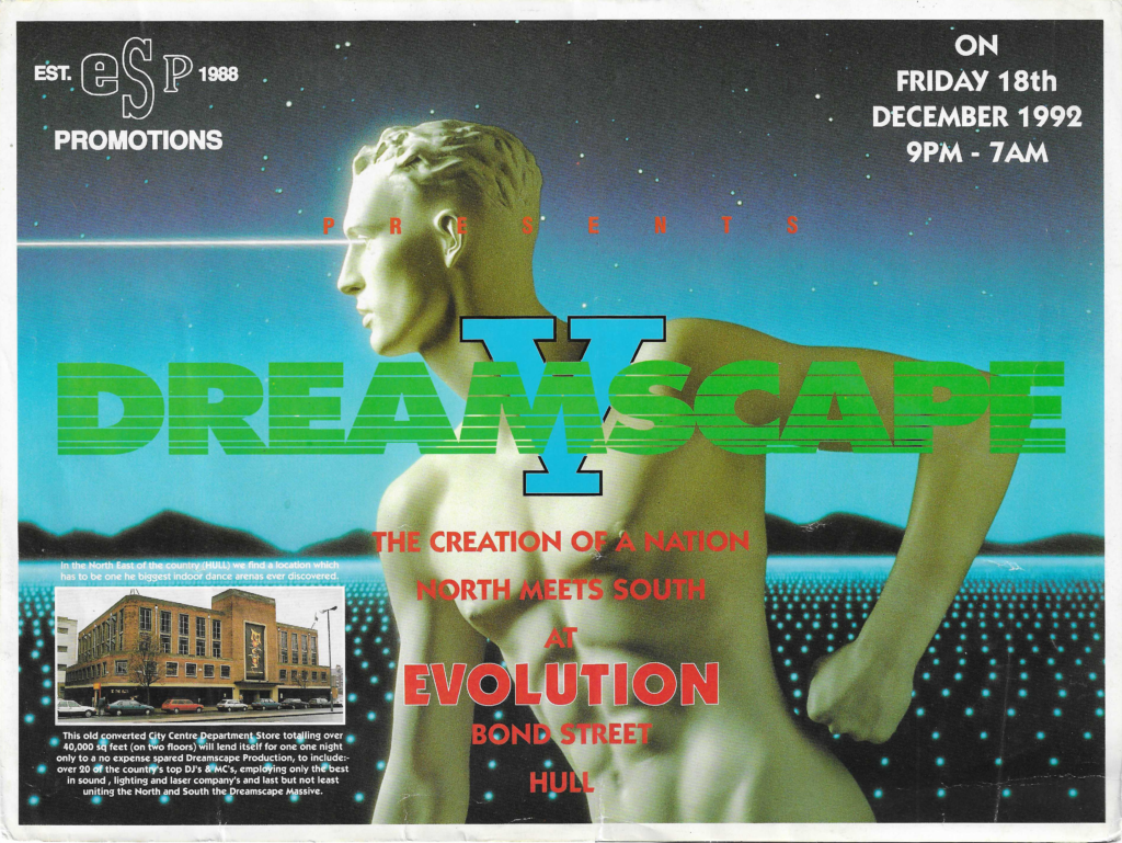 ESP Promotions 24th January 1992 10th April 1992 – Dreamscape III 29th May 1992 – Dreamscape IV 18th December 1992 – Dreamscape V 28th May 1993 – Dreamscape VI 19th June 1993 – The Meeting Of Two Minds 26th November 1993 – Dreamscape VII 31st December 1993 – Dreamscape VIII 8th April 1994 – Dreamscape X 29th April 1994 – Baby Dreamscape 1st July 1994 – Dreamscape XI 26th August 1994 – Dreamscape XII 29th October 1994 – Dreamscape XIV