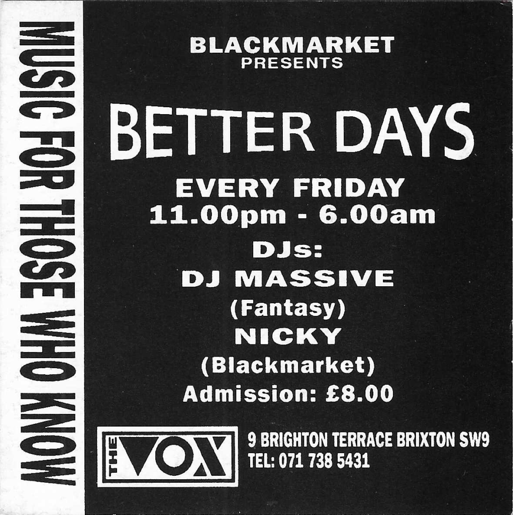 | Every Friday | The Vox, Brighton Terrace, London | Better Days |