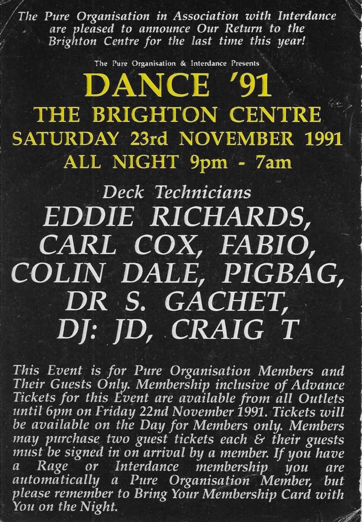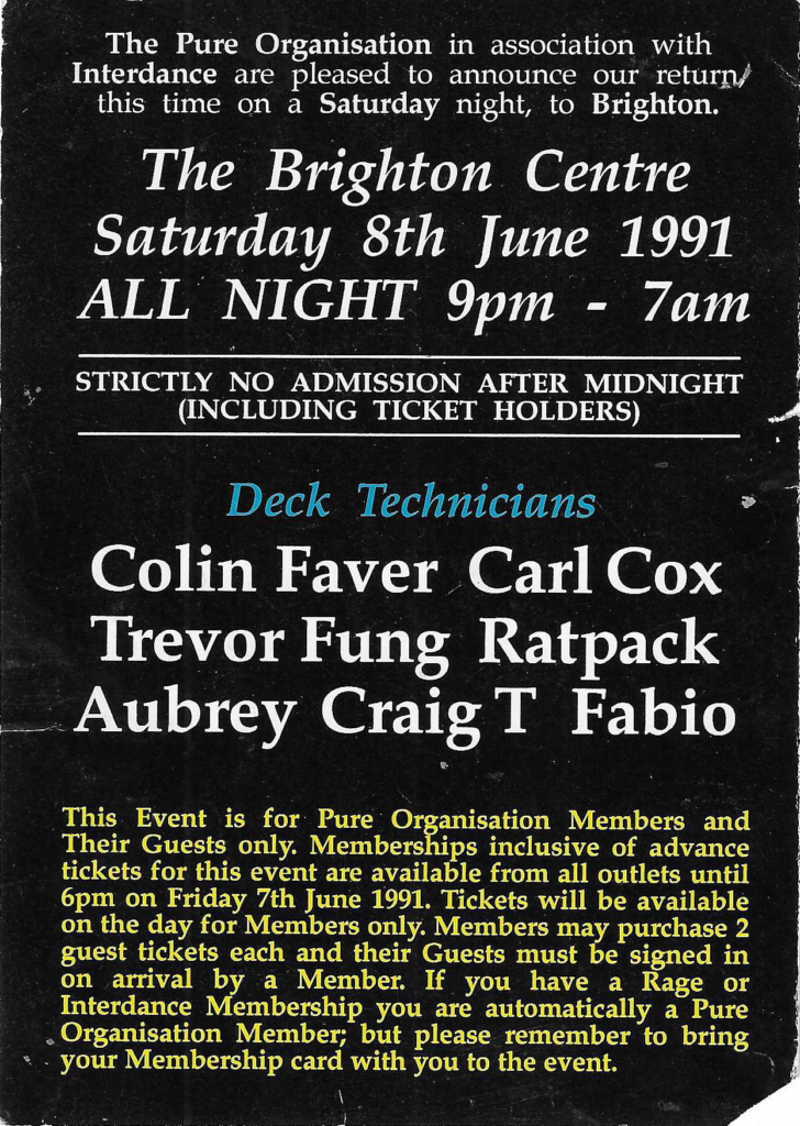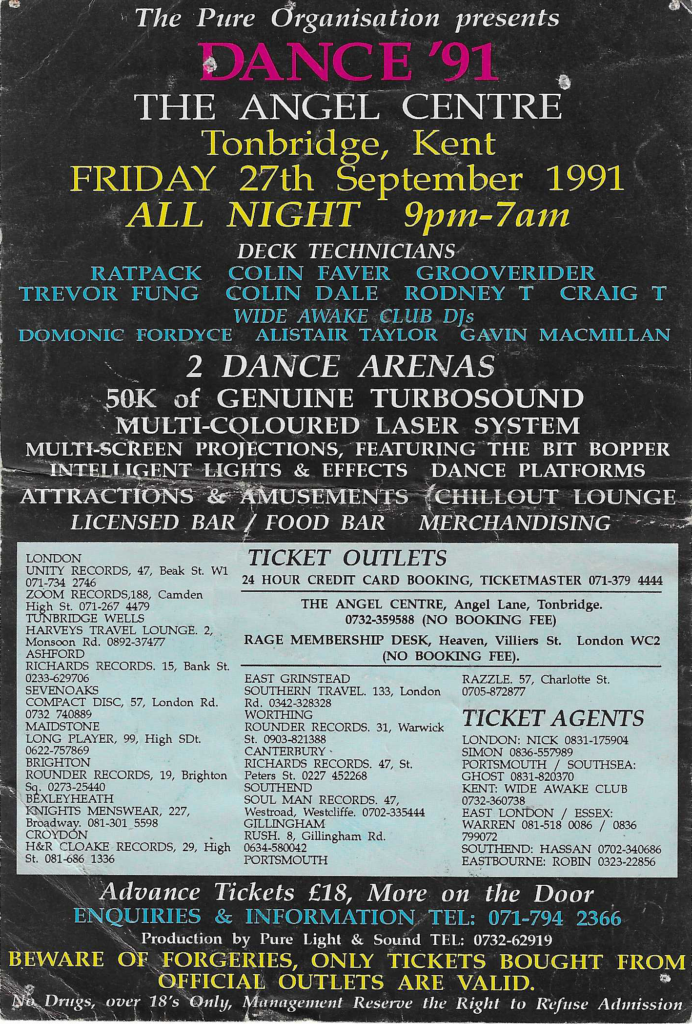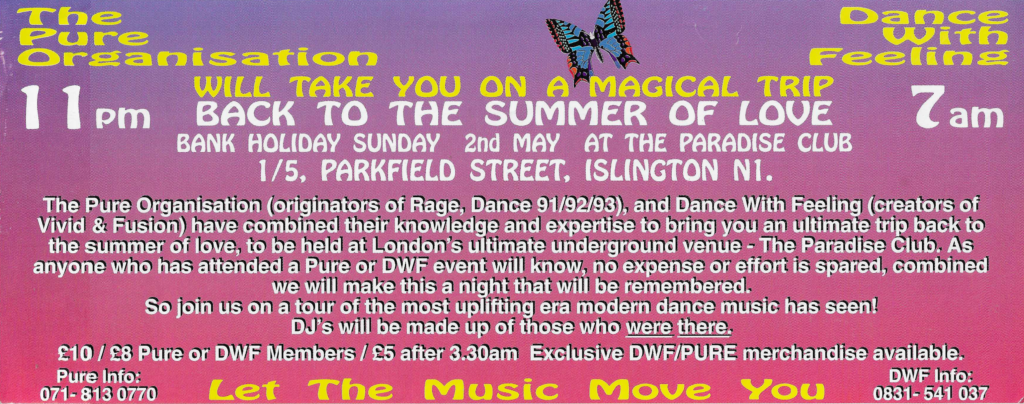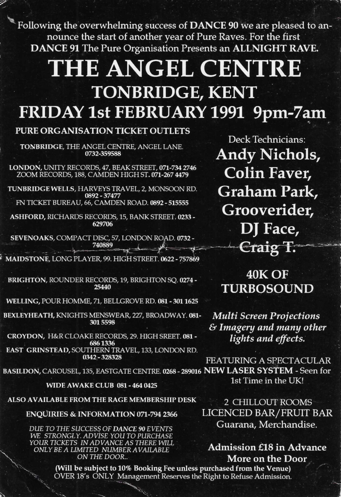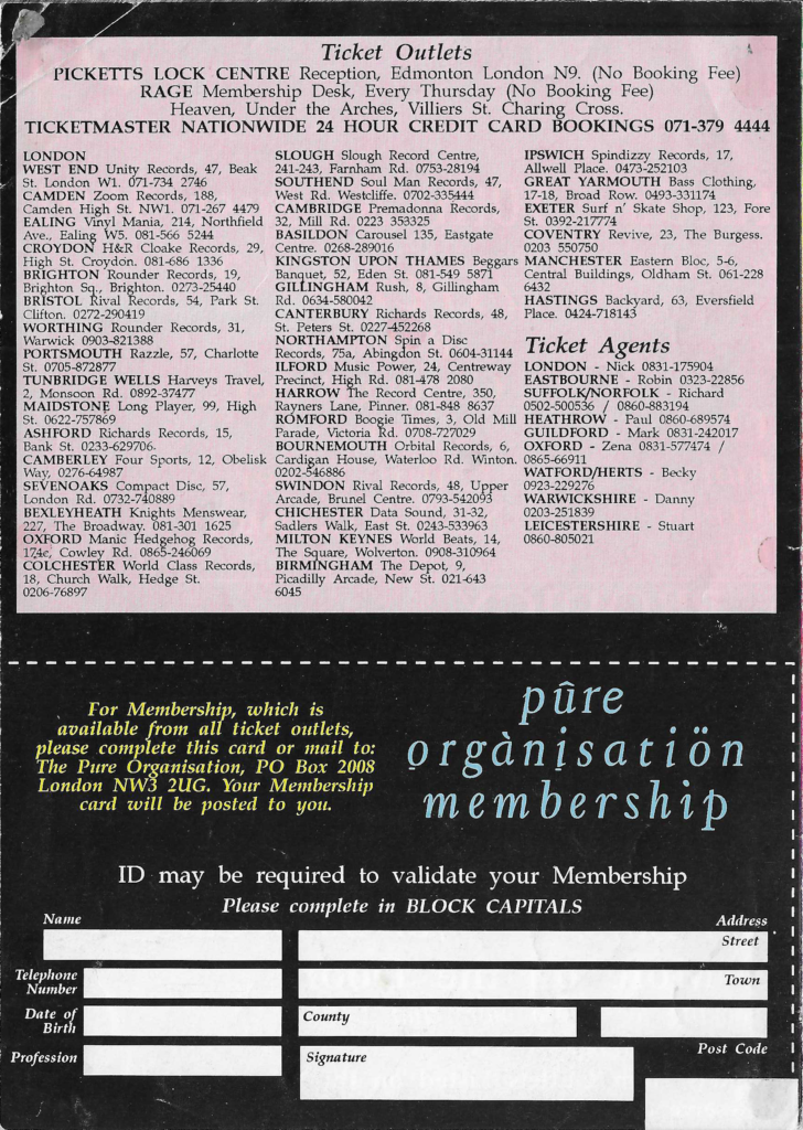The Pure Organisation 1st September 1990 – Dance ’90 7th December 1990 – Dance ’90 1st February 1991 – Dance ’91 8th June 1991 – Dance ’91 21st June 1991 – A Midsummer Night’s Dream 2nd August 1991 – Dance ’91 10th August 1991 27th September 1991 – Dance ’91 23rd November 1991 – Dance ’91 13th March 1993 – Dance ’93 2nd May 1993 – Back To The Summer Of Love 5th June 1993 – Playground 1993 – Playground Dance ’93 Tags – Dance 91 – Rage – The Pure Organisation
