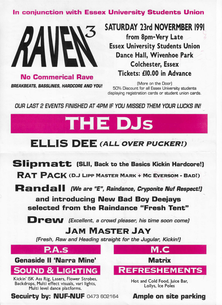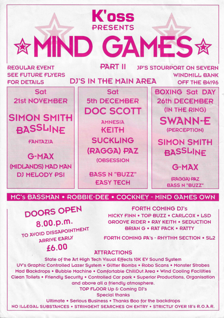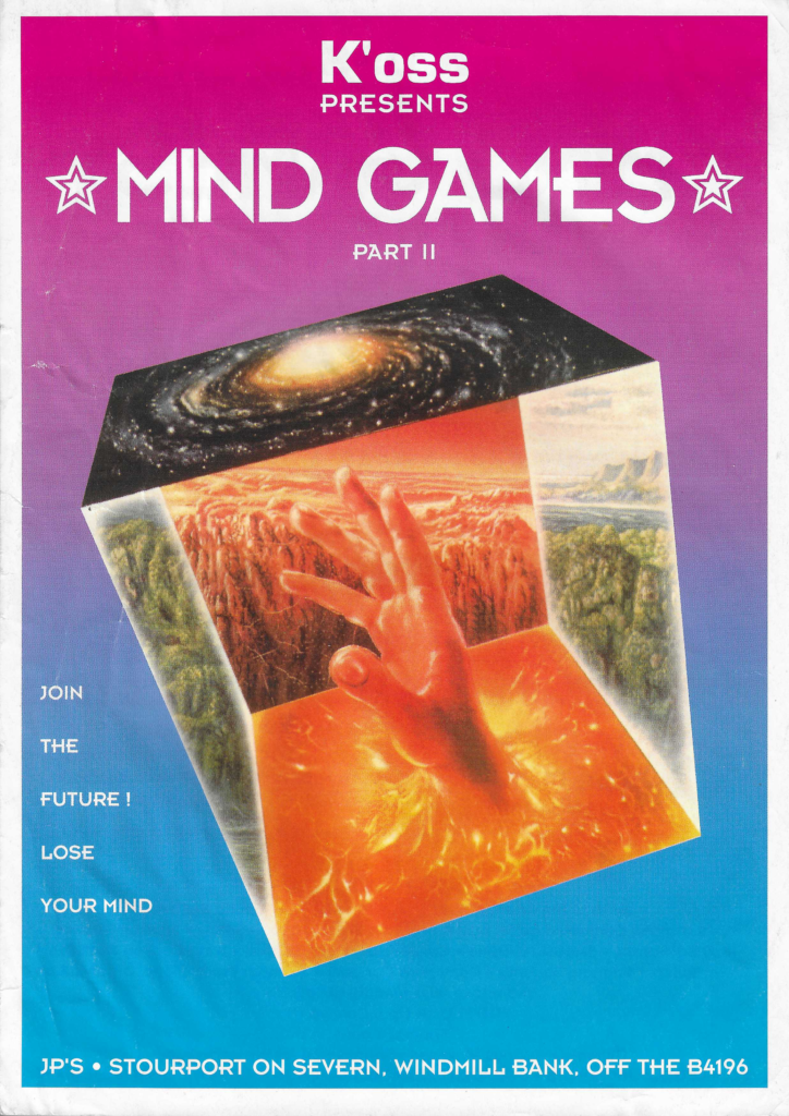 Seemingly only this flyer exists for any event at JP’s in Stourport On Severn (better known as The Severn Manor), and there is nothing else I can find promoted by K’oss. Did Mind Games Part I actually happen?