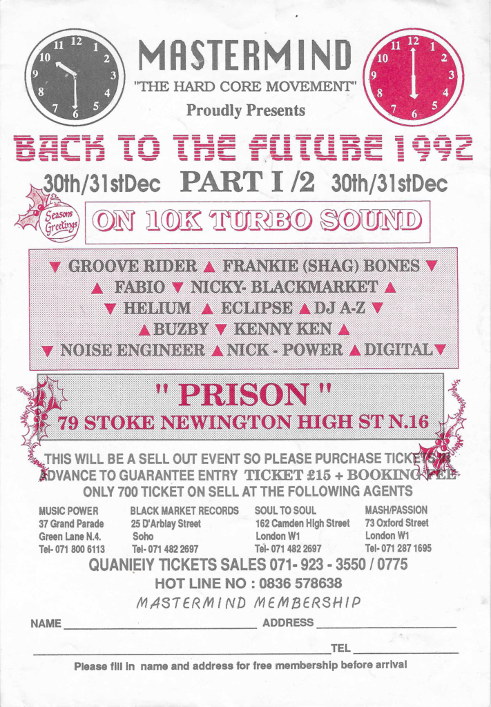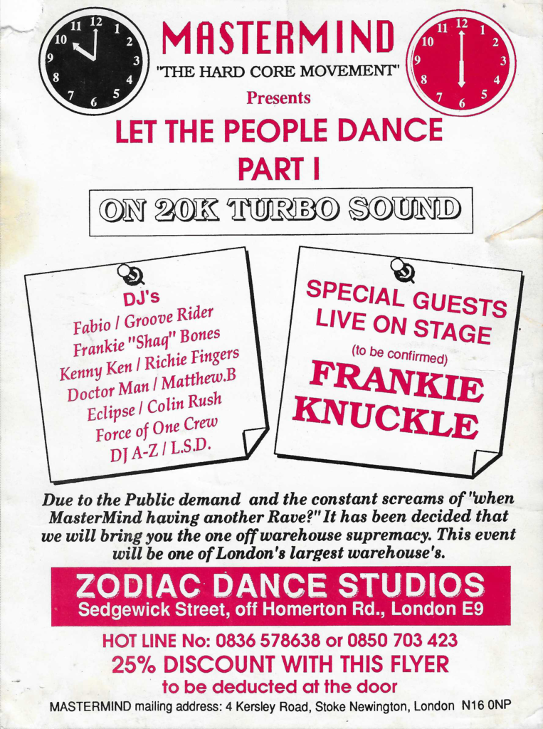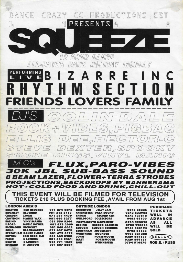 Event organisers from the early 1990s like Fantazia, Raindance, Universe, Helter Skelter, Dreamscape (ESP Promotions), Amnesia House, Labrynth, Dance Paradise, Perception and Obsession