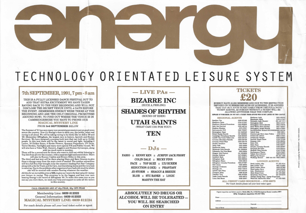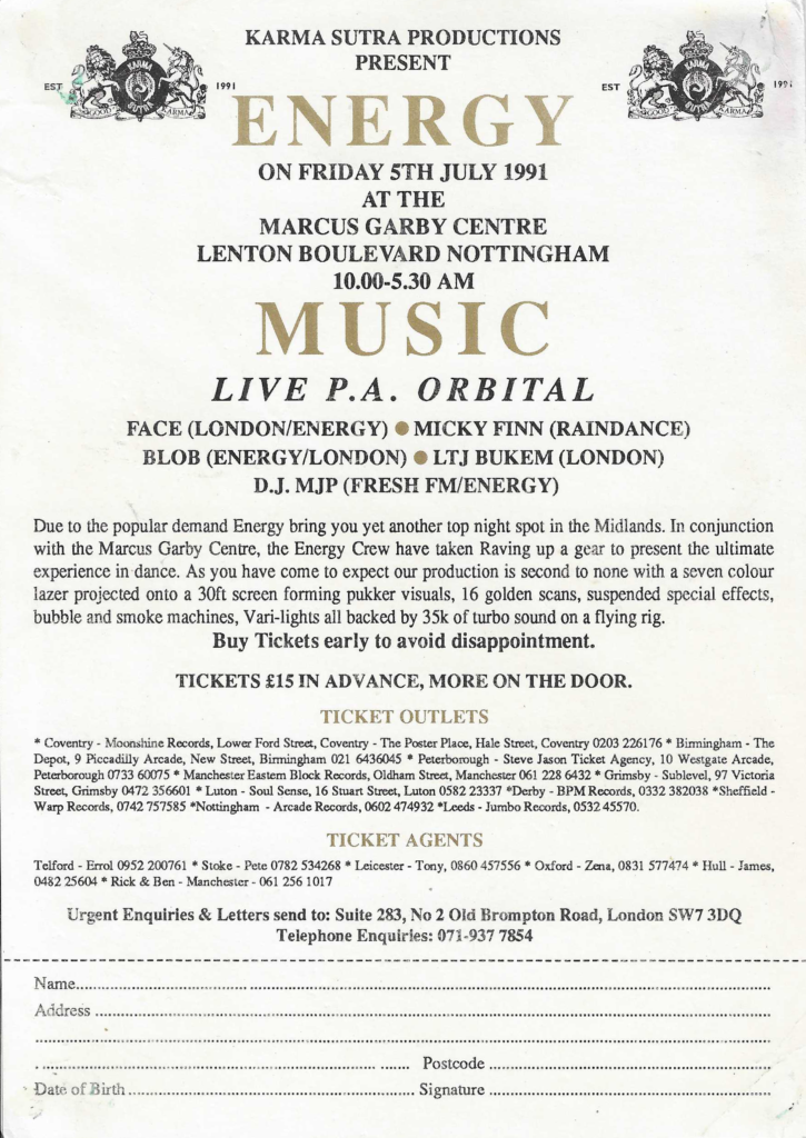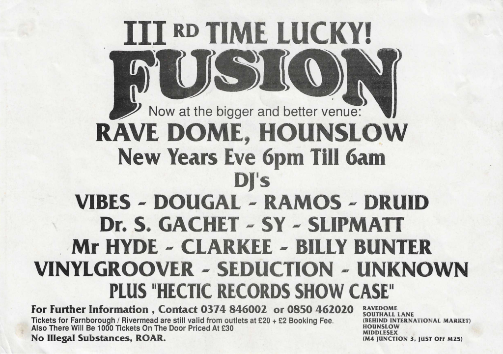 Energy ’92 was co-promoted by Karma Productions and Hectic Productions. It was mentioned in the text on the October 23rd Fusion flyer and the main image of the 2 faces is consistently used on many subsequent Fusion flyers.
