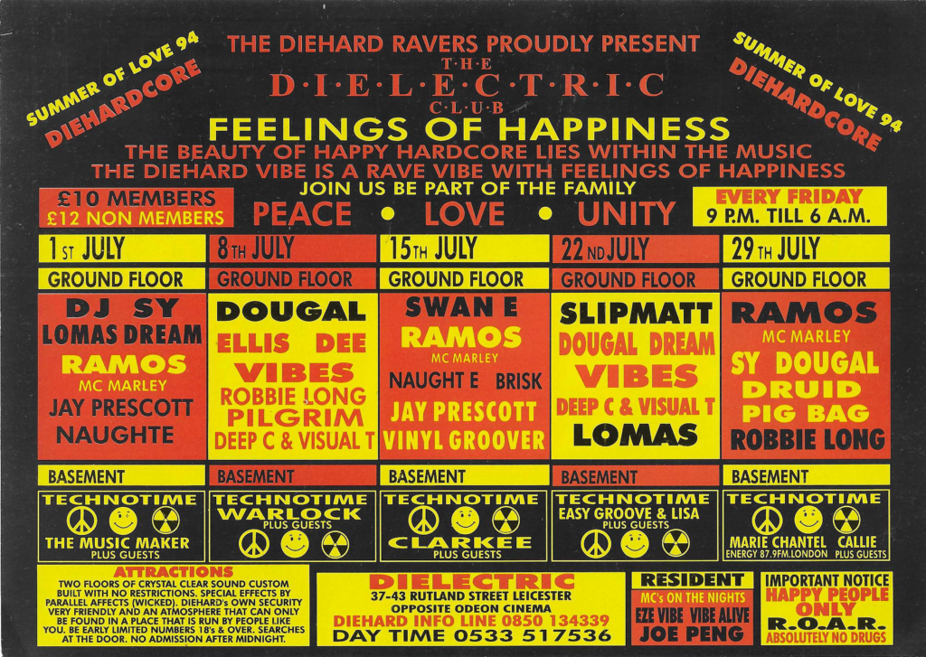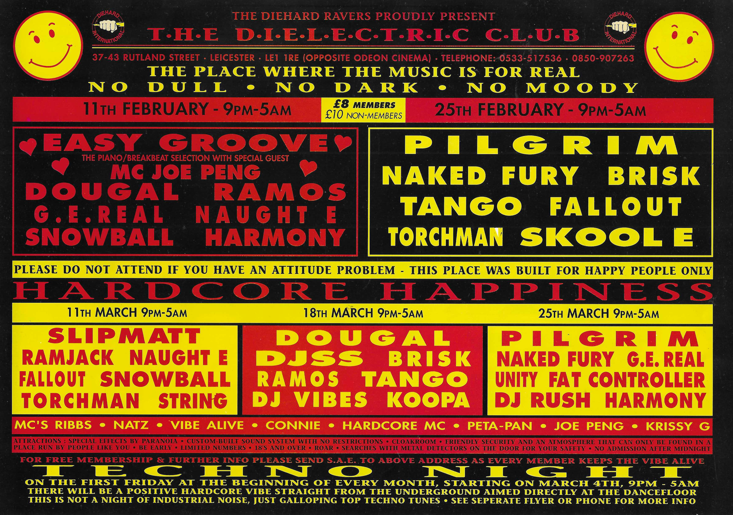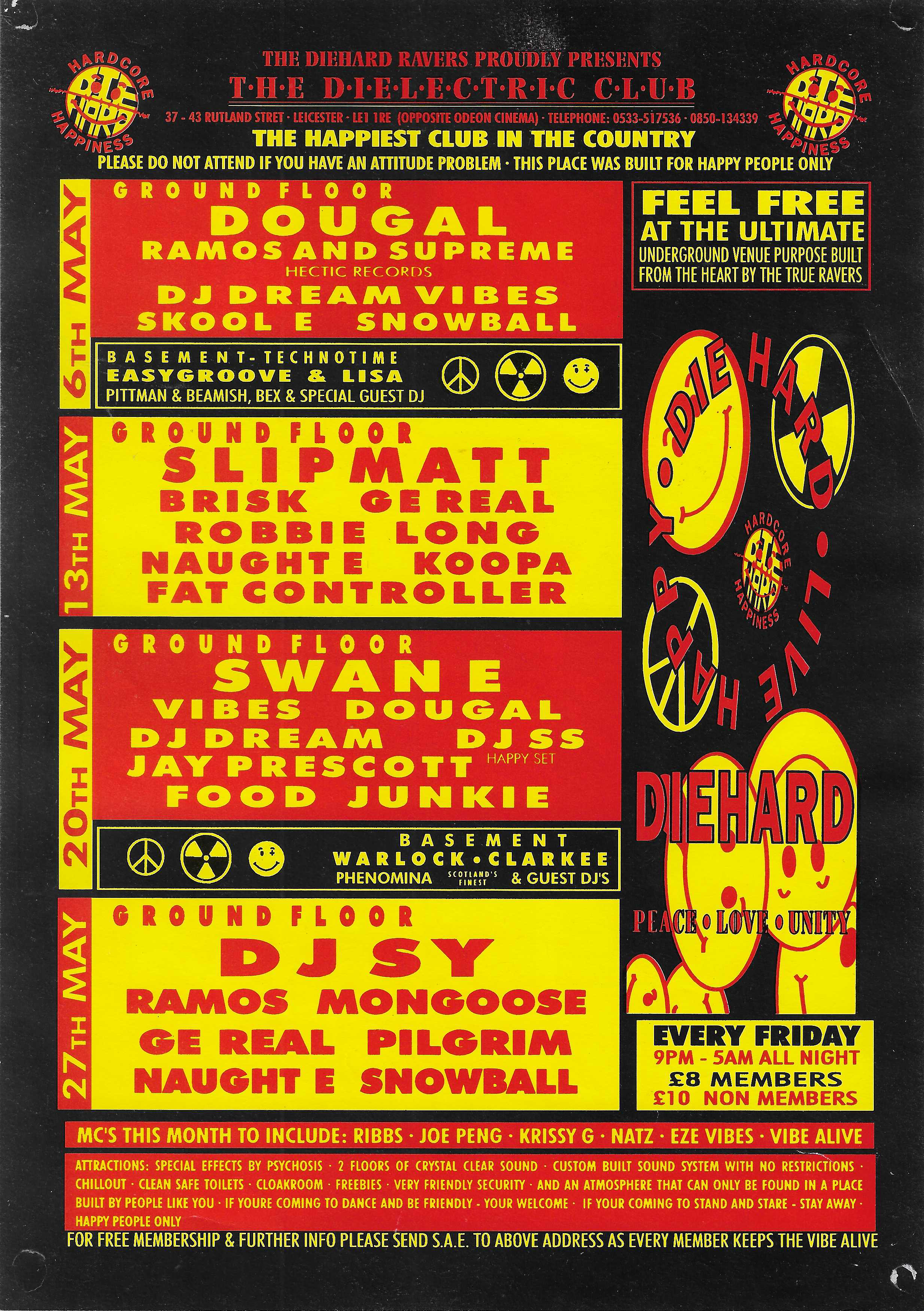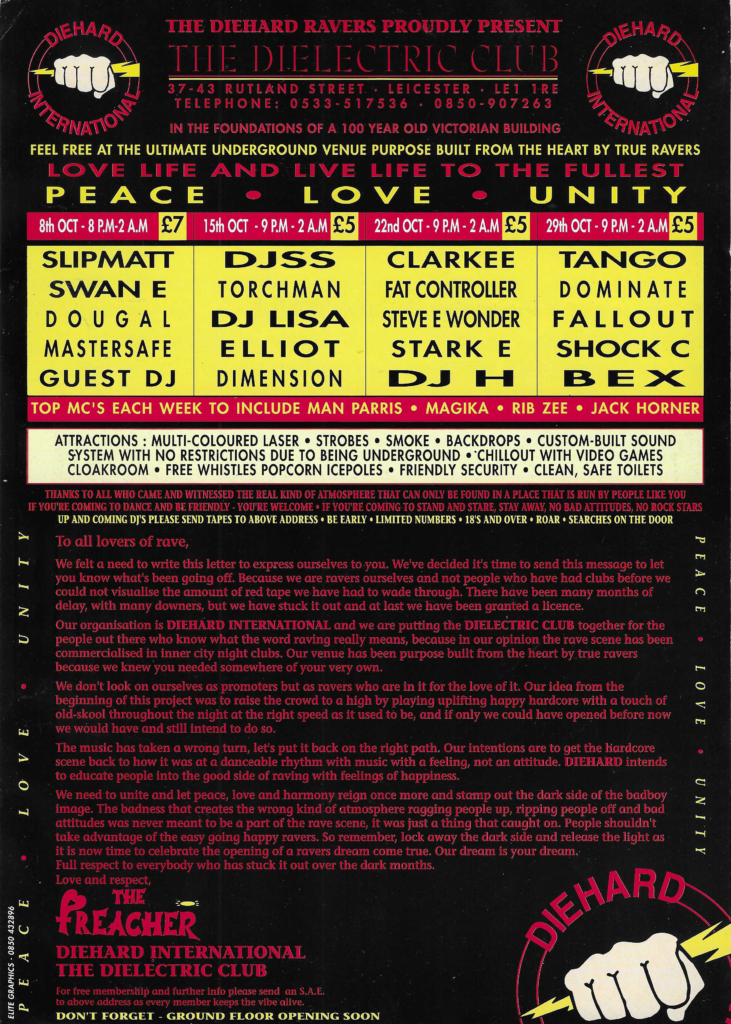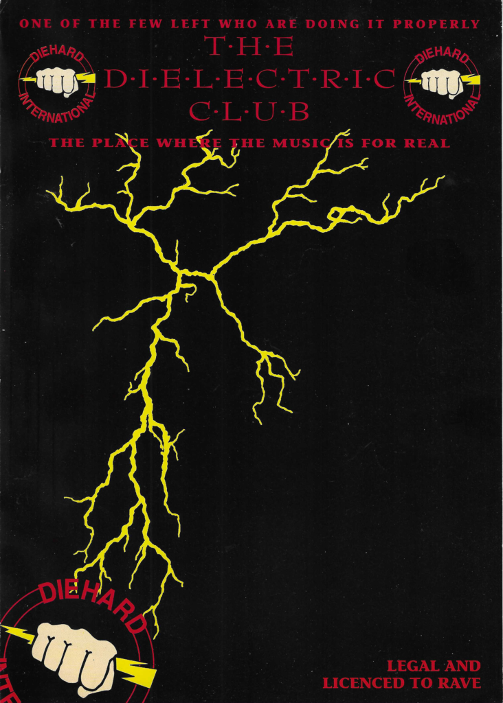 Our organisation is DIEHARD INTERNATIONAL and we are putting the DIELECTRIC CLUB together for the people out there who know what the word raving really means, because in our opinion the rave scene has been commercialised in inner city night clubs. Our venue has been purpose built from the heart by true ravers because we knew you needed somewhere of your very own.