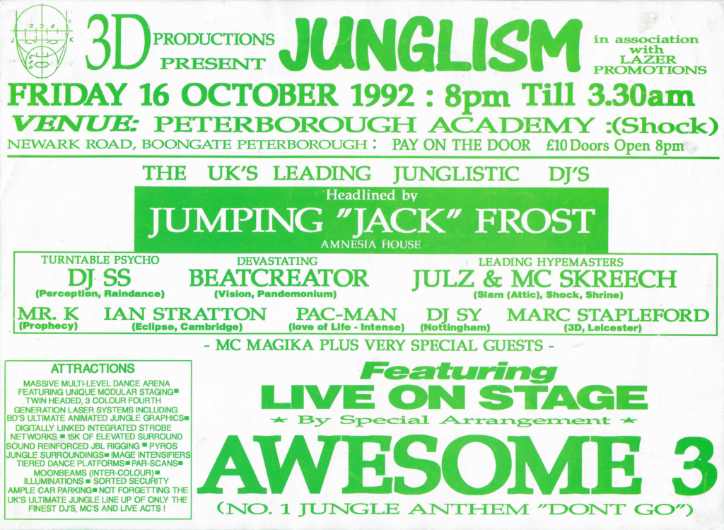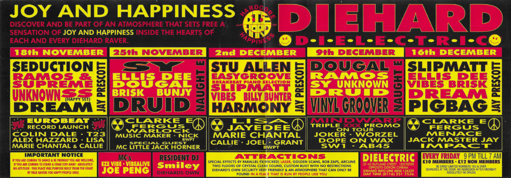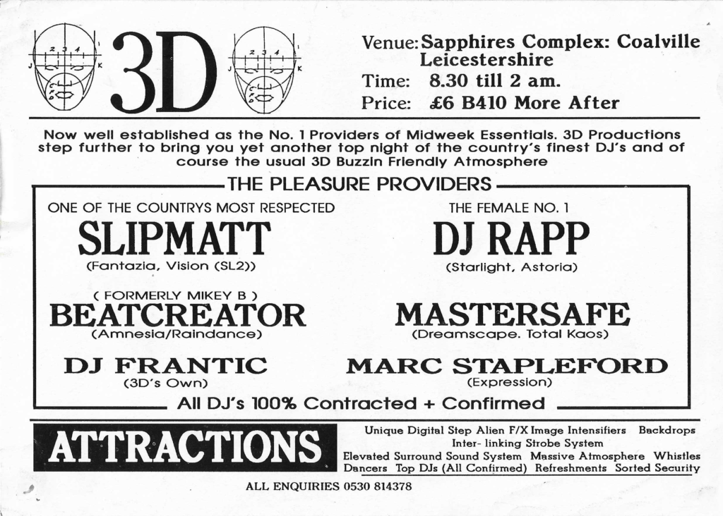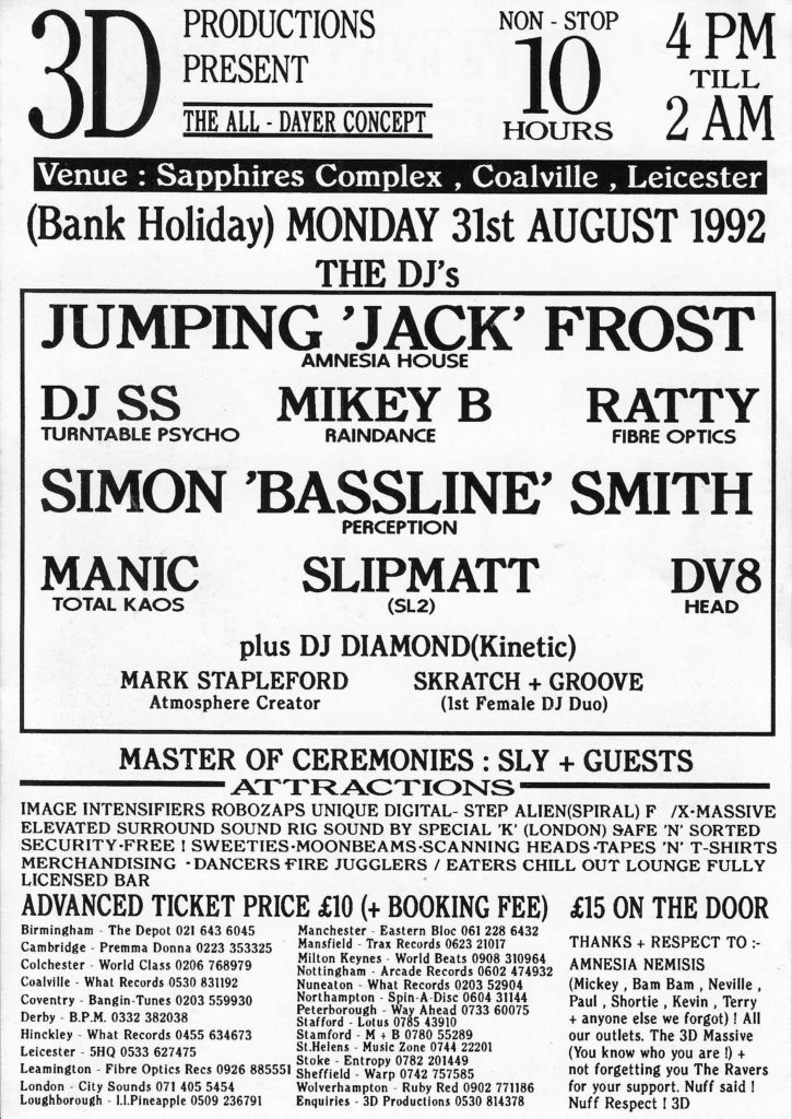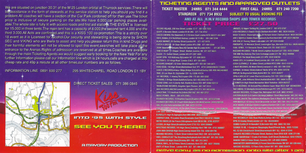 I’m not 100% certain on the info here, or even if this event actually took place (TBC). Kiss 100 FM and Pump Action seem to be the backers and on the rear of the flyer it says it’s a Mayday Promotion. I don’t remember seeing this being advertised back in the day and I checked the event listings in the December 1994 issue of Atmosphere magazine, and there is nothing listed in there.