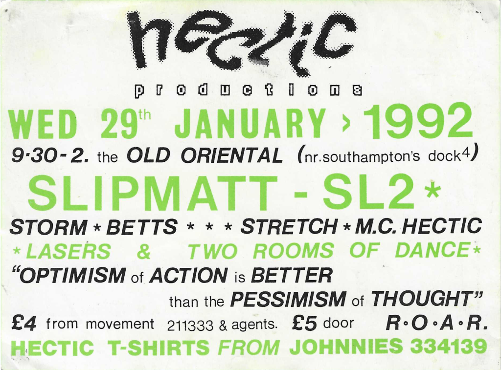 Energy ’92 was co-promoted by Karma Productions and Hectic Productions. It was mentioned in the text on the October 23rd Fusion flyer and the main image of the 2 faces is consistently used on many subsequent Fusion flyers.