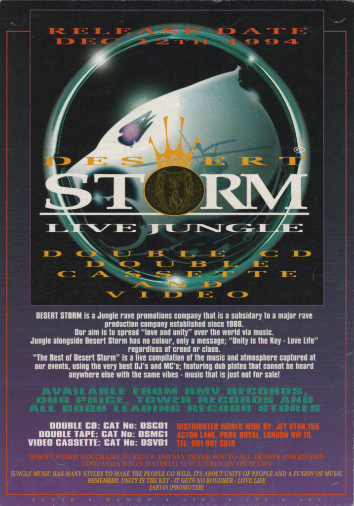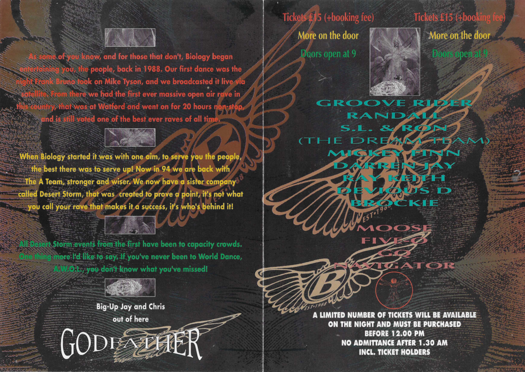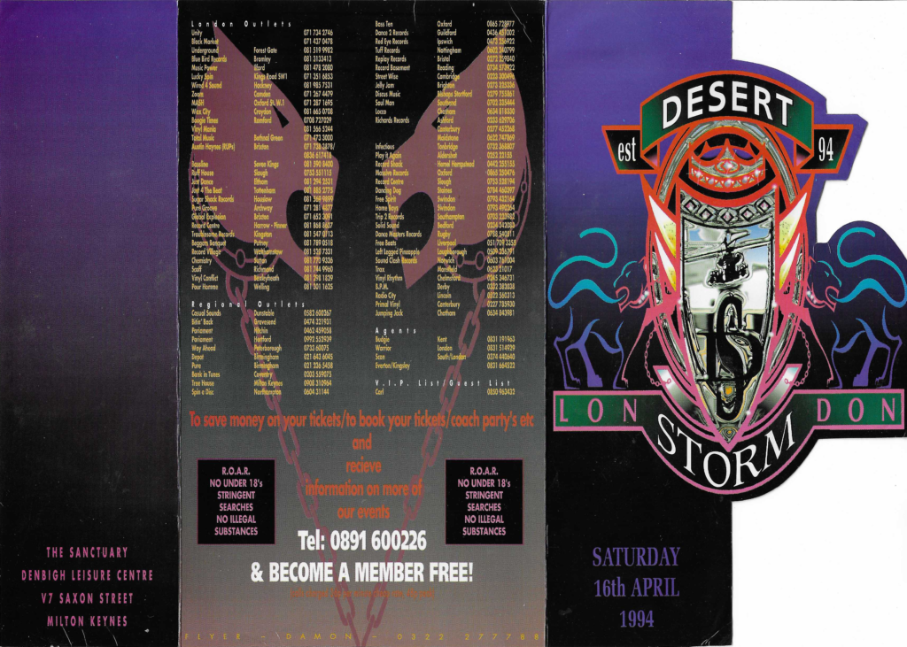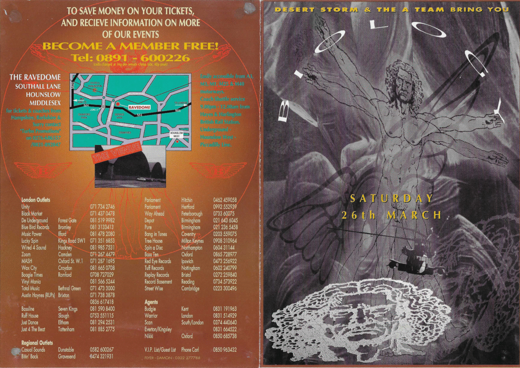 But back to the past, and no retrospective would be complete without a mention of the truly huge triumphs (and disasters) such as Vision at Popham (40,000 people and not a single dry place to stand and Keith from Prodigy rolling in the mud) Fantazia at Donnington (spending all night looking for your friends and trying to work out why the sound was so low), the Universe parties before they got too big, the Perceptions, the T2 hangars, having to get your car towed from muddy car parks, the police checks on the way to Wisbech, the arrests at Wisbech. Watching the sun come up over the sea at all the raves at the seaside like Reincarnation in Kent, Storm at Hastings, Destiny at Clacton. Remember the queues at Telepathy, Marshgate Lane every week? And what about that Fantazia at Bournemouth with all the television coverage of everyone sitting on the beach afterwards? Sterns has to be mentioned, still sorely missed, in memory of Mensa who died in a car accident last month.