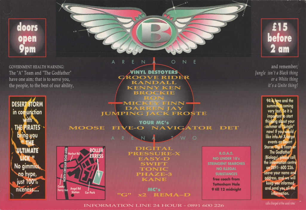 Then there were the Dance ’91 at Pickets Lock promoted by Pure. Huge events, over 4,000 indoors until they got stopped by complaints about the noise levels from nearby residents. There’s a twelve screen cinema just opened on the site recently. And talking of Pure, they were of course responsible for the long running Rage at Heaven every Thursday night, always at the forefront of the new music. Rage was the place where you went every week and met everyone and there were always DJ’s running around with the newest tunes under there arms, just hot off the press and given to them by the record companies who knew that they’d find all the major DJ’s there, every week. Who remembers the Rage Halloween party where some poor sod spent the night in a bathful of maggots? Or the beach party towards the end where the floor of the whole venue was covered in sand and the stage opened up to reveal a swimming pool! ’91 was also the heyday of the Wonderland Arena in East London, hot, sweaty and disgusting facilities but what raves! Elevation in particular I remember, one absolutely rammed with the MC telling us all how the tent at Raindance that night had become unsafe – it did, I was there and everyone was sent home early.