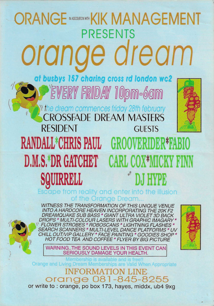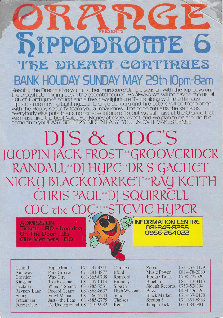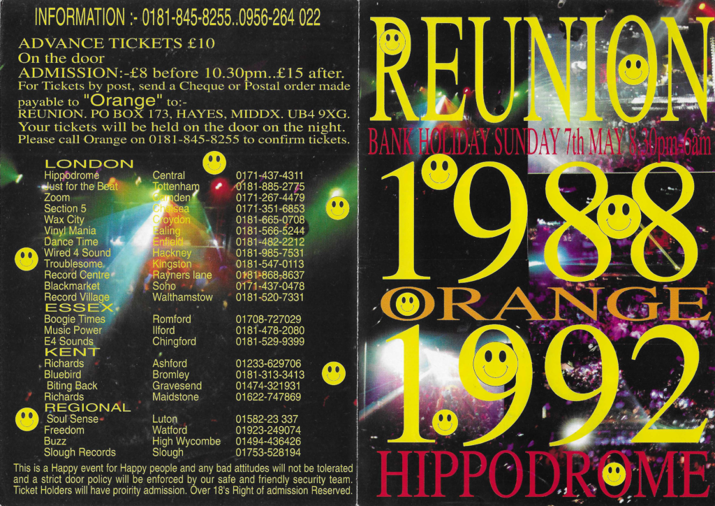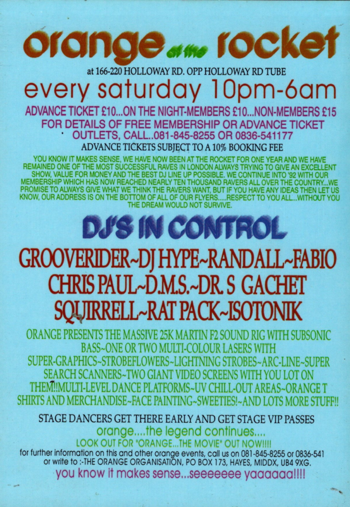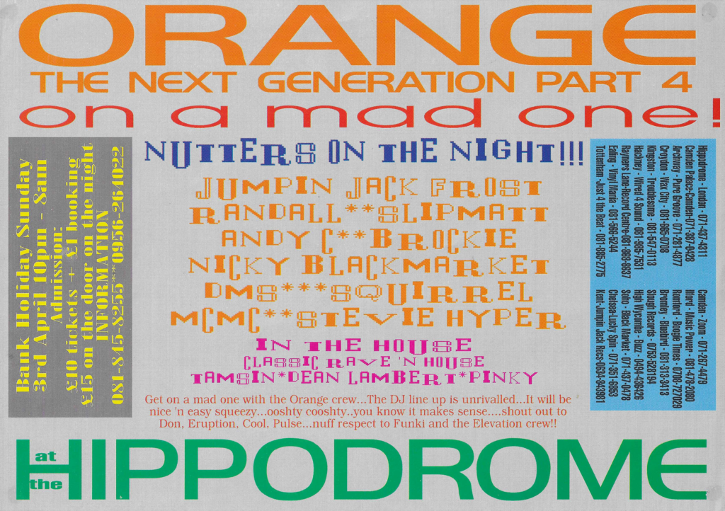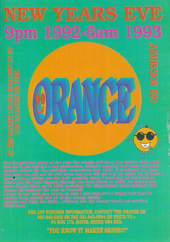 Orange TBC November 1991 – Orange at the Rocket 1992 – Breakfast Club @ Busbys 1992 – Orange Dream 1992 – Orange Dream every Friday 19th April 1992 – Hippodrome II The Return 4th July 1992 – A New Age July 1992 – Aquarius 31st August 1992 – Hippodrome 5 1992 – Orange at the Rocket 31st December 1992 29th August 1993 – Hippodrome 10 (TBC) 1993 – Club Orange (TBC) 1993 – Guest Pass 1993 – Orange at the Camden Palace 30th May 1993 – Hippodrome IX 26th June 1993 – Astoria 3rd April 1994 – The Next Generation Part 4 April 1994 – Get on a “C” 1st May 1994 – The Next Generation Part 5 7th May 1994 – Class of ’88-’92 Reunion 29th May 1994 – Hippodrome 6 25th June 1994 – Rave 30th July 1994 – Astoria Part 2 28th August 1994 – Hippodrome 7 Tags – Orange – Orange at the Rocket – Orange Hippodrome