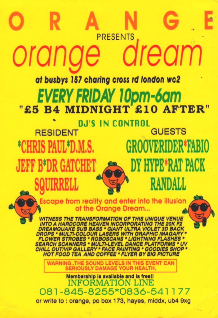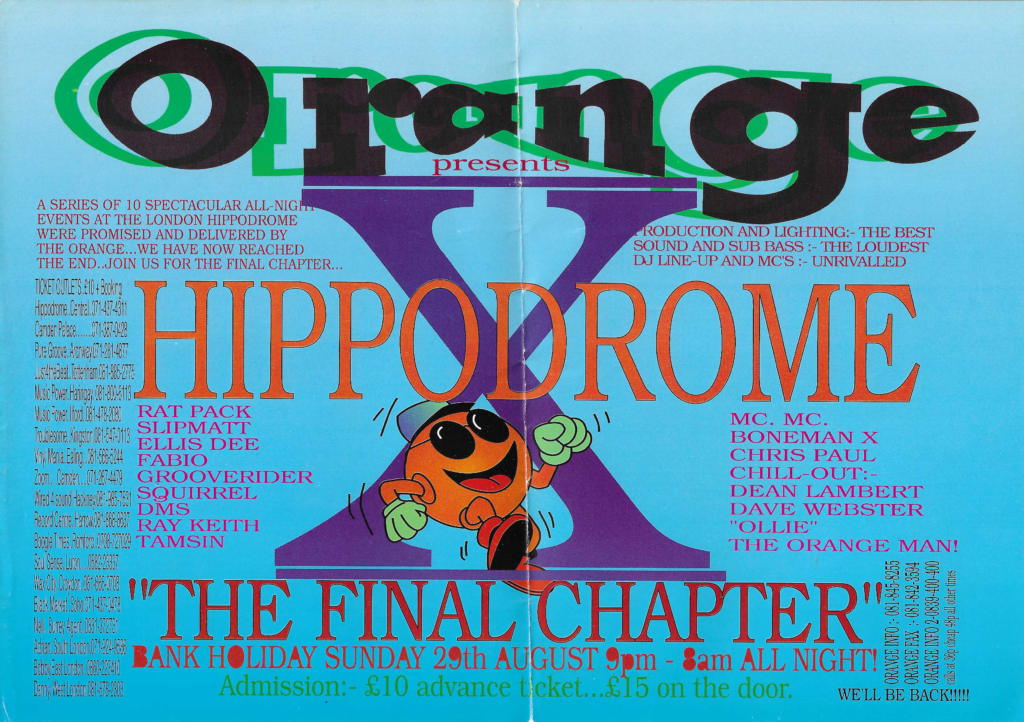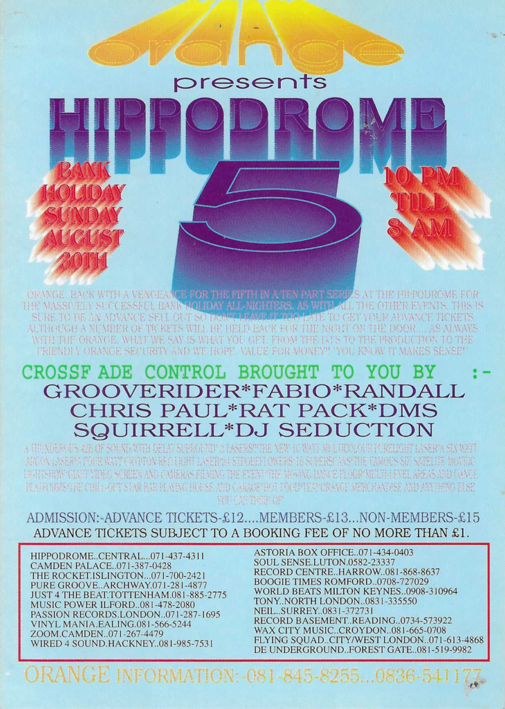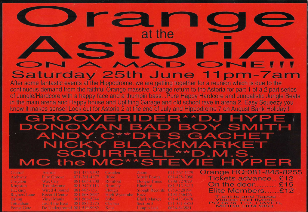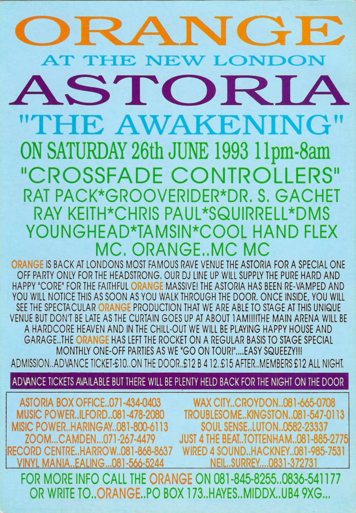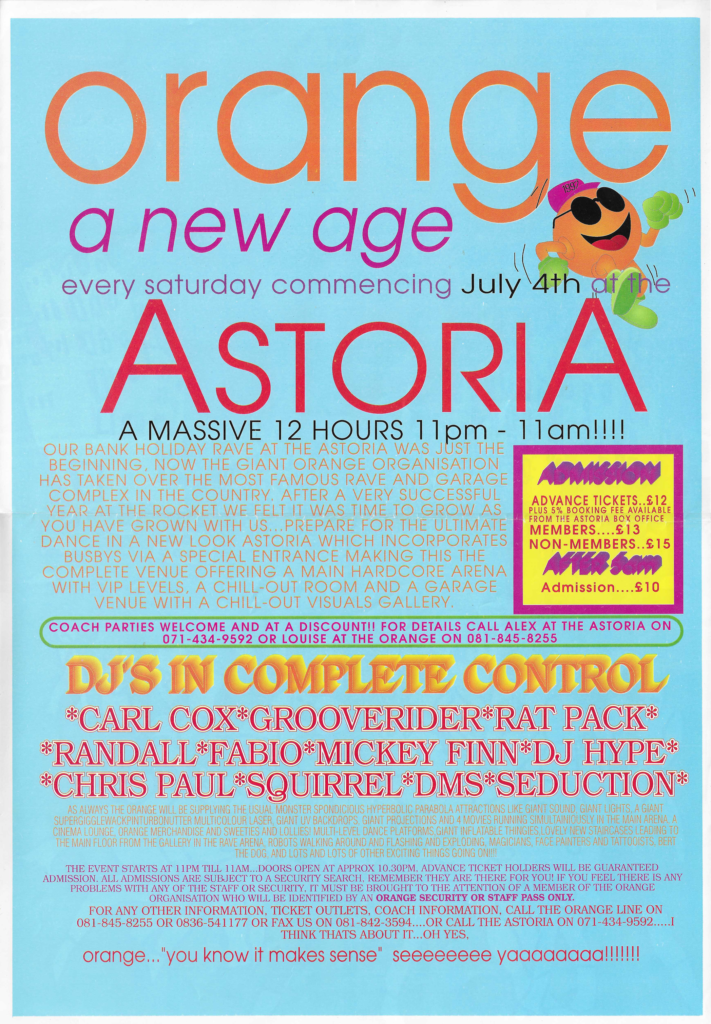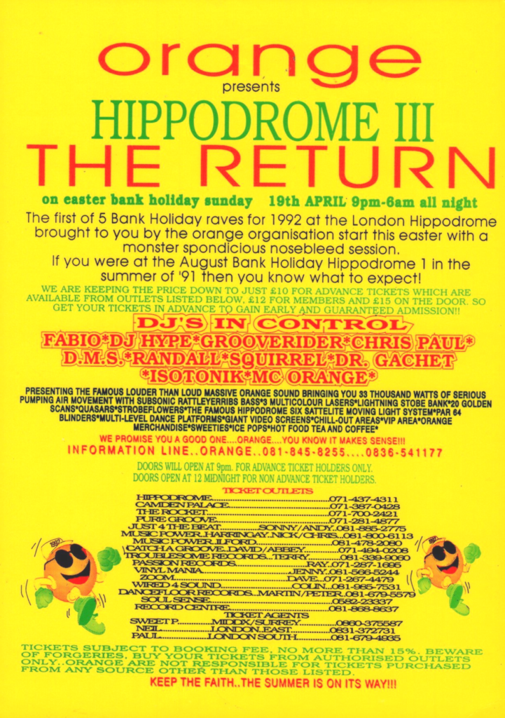 Orange TBC November 1991 – Orange at the Rocket 1992 – Breakfast Club @ Busbys 1992 – Orange Dream 1992 – Orange Dream every Friday 19th April 1992 – Hippodrome II The Return 4th July 1992 – A New Age July 1992 – Aquarius 31st August 1992 – Hippodrome 5 1992 – Orange at the Rocket 31st December 1992 29th August 1993 – Hippodrome 10 (TBC) 1993 – Club Orange (TBC) 1993 – Guest Pass 1993 – Orange at the Camden Palace 30th May 1993 – Hippodrome IX 26th June 1993 – Astoria 3rd April 1994 – The Next Generation Part 4 April 1994 – Get on a “C” 1st May 1994 – The Next Generation Part 5 7th May 1994 – Class of ’88-’92 Reunion 29th May 1994 – Hippodrome 6 25th June 1994 – Rave 30th July 1994 – Astoria Part 2 28th August 1994 – Hippodrome 7 Tags – Orange – Orange at the Rocket – Orange Hippodrome