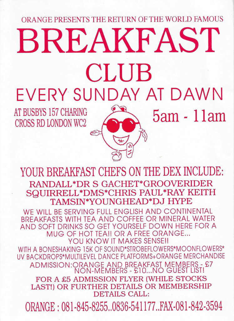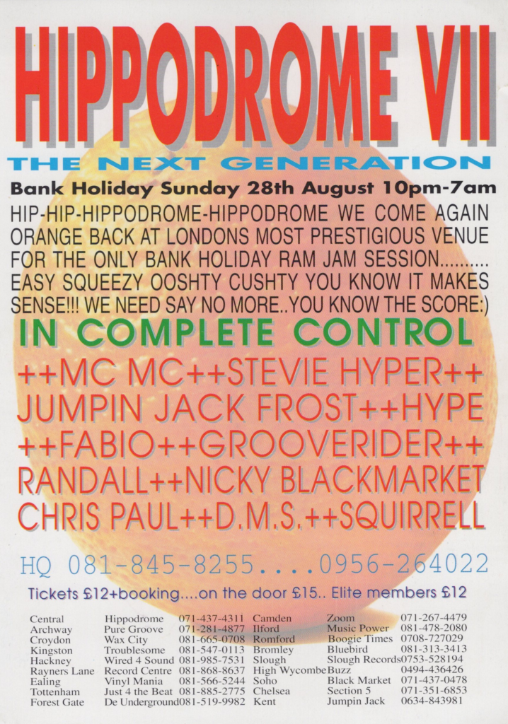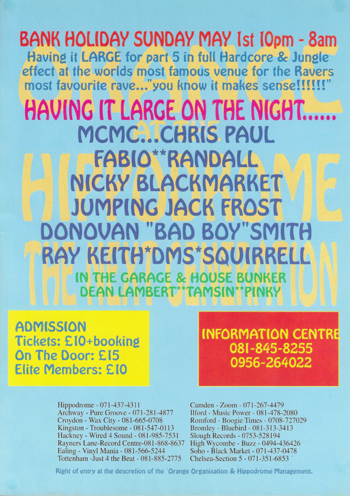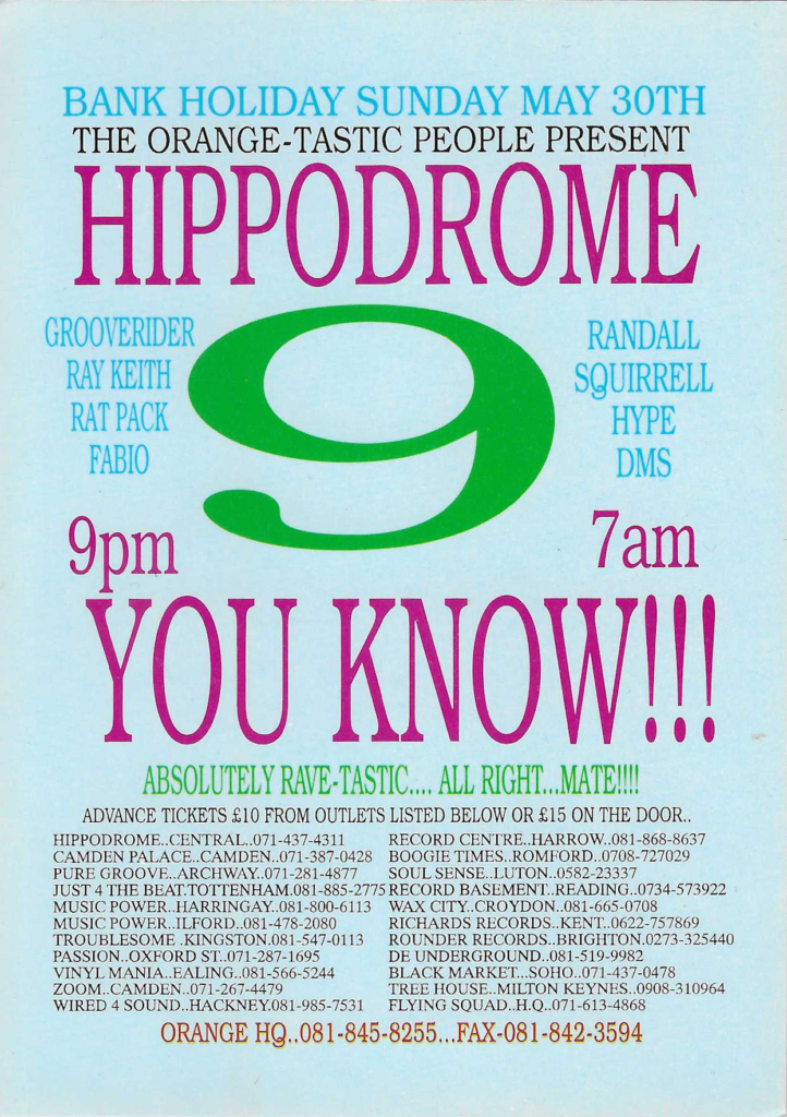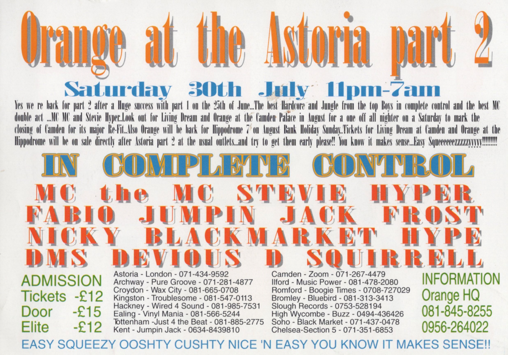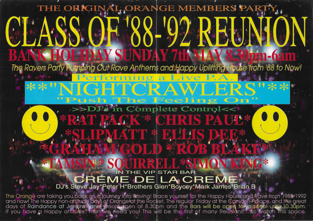 Orange TBC November 1991 – Orange at the Rocket 1992 – Breakfast Club @ Busbys 1992 – Orange Dream 1992 – Orange Dream every Friday 19th April 1992 – Hippodrome II The Return 4th July 1992 – A New Age July 1992 – Aquarius 31st August 1992 – Hippodrome 5 1992 – Orange at the Rocket 31st December 1992 29th August 1993 – Hippodrome 10 (TBC) 1993 – Club Orange (TBC) 1993 – Guest Pass 1993 – Orange at the Camden Palace 30th May 1993 – Hippodrome IX 26th June 1993 – Astoria 3rd April 1994 – The Next Generation Part 4 April 1994 – Get on a “C” 1st May 1994 – The Next Generation Part 5 7th May 1994 – Class of ’88-’92 Reunion 29th May 1994 – Hippodrome 6 25th June 1994 – Rave 30th July 1994 – Astoria Part 2 28th August 1994 – Hippodrome 7 Tags – Orange – Orange at the Rocket – Orange Hippodrome