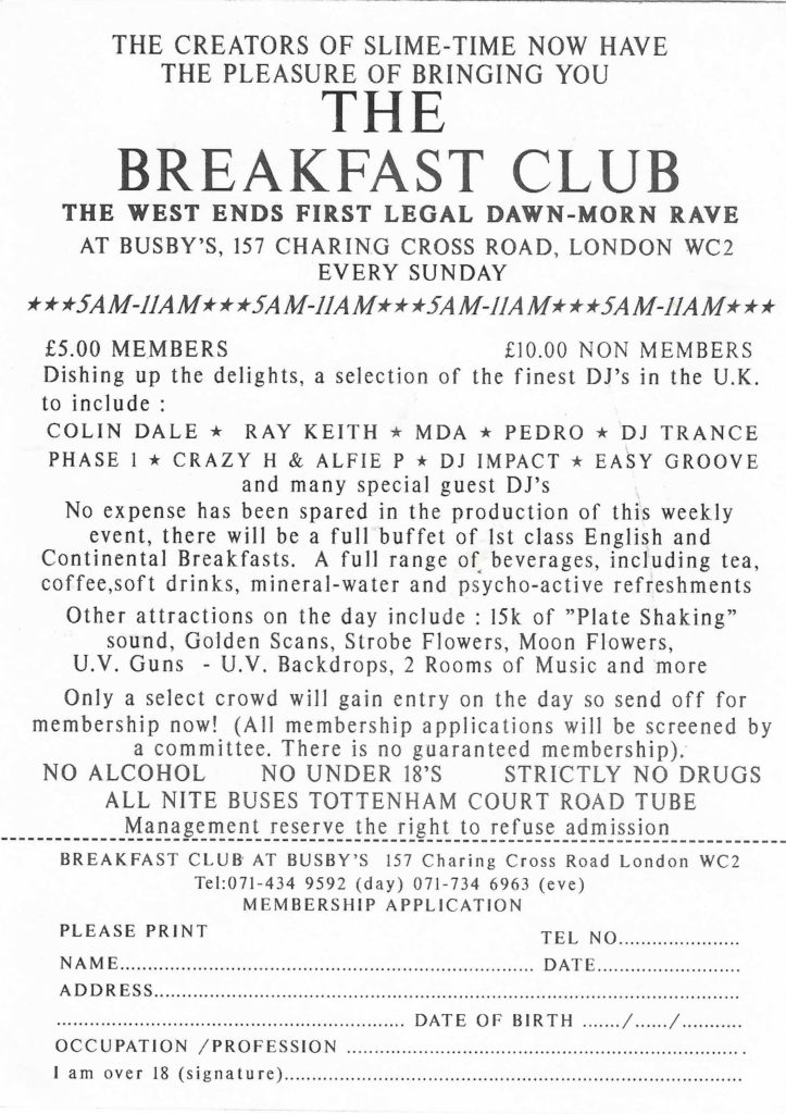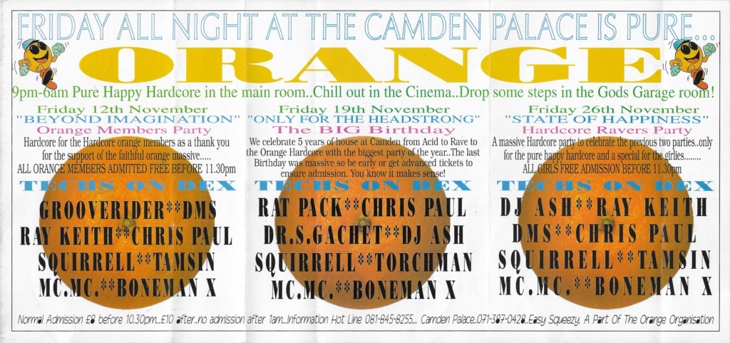 Orange TBC November 1991 – Orange at the Rocket 1992 -The Breakfast Club 1992 – Breakfast Club @ Busbys 1992 – Orange Dream 1992 – Orange Dream every Friday 19th April 1992 – Hippodrome II The Return 4th July 1992 – A New Age July 1992 – Aquarius 31st August 1992 – Hippodrome 5 1992 – Orange at the Rocket 31st December 1992 29th August 1993 – Hippodrome 10 (TBC) 1993 – Club Orange (TBC) 1993 – Guest Pass 1993 – Orange at the Camden Palace 30th May 1993 – Hippodrome IX 26th June 1993 – Astoria 12th – 26th November 1993 12th February 1994 – The Next Generation Part 3 3rd April 1994 – The Next Generation Part 4 April 1994 – Get on a “C” 1st May 1994 – The Next Generation Part 5 7th May 1994 – Class of ’88-’92 Reunion 29th May 1994 – Hippodrome 6 25th June 1994 – Rave 30th July 1994 – Astoria Part 2 28th August 1994 – Hippodrome 7 Tags – Orange – Orange at the Rocket – Orange Hippodrome