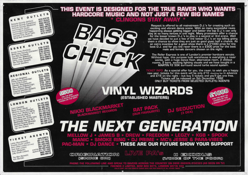 Nothing on the flyer about who promoted the Bass Check event(s) and a search of the Internet turned up nothing either. Issue 7 of Blaze Magazine has an advert for this event, which is essentially this flyer, as well as a listing in the one-offs section which gives no further information.